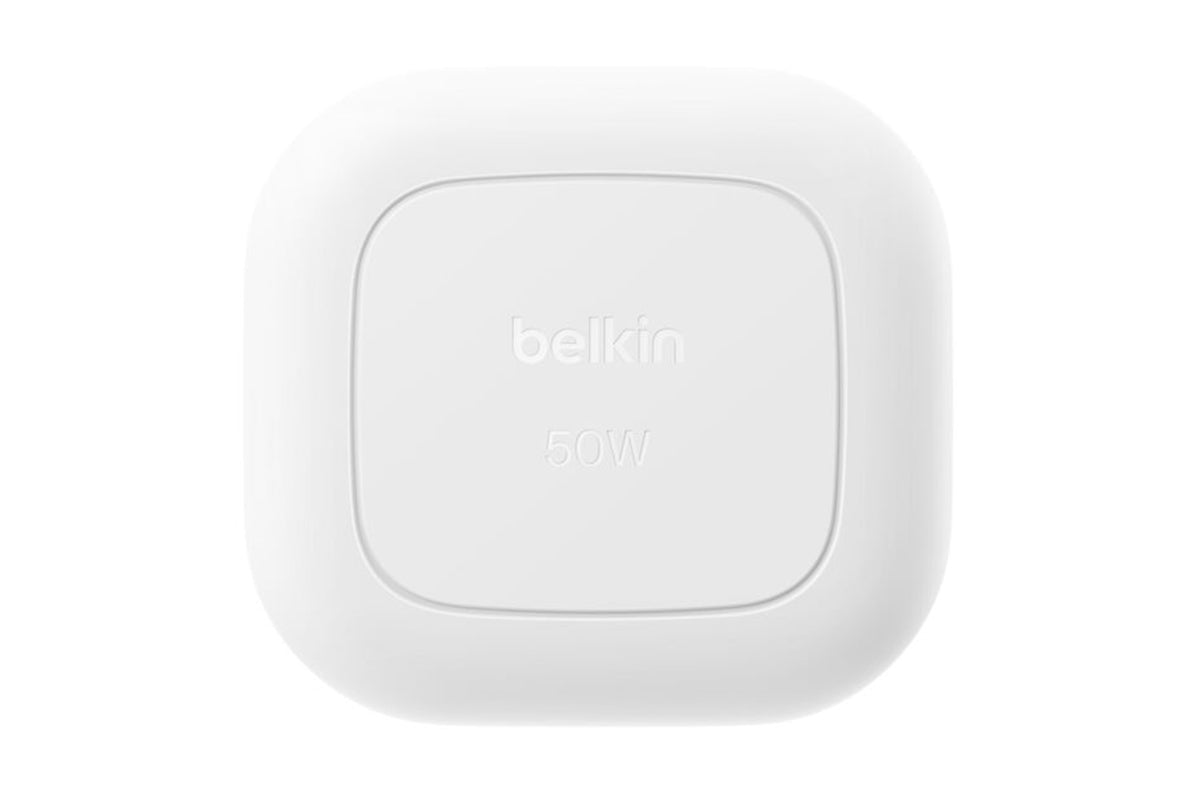 Based on internal testing. Belkin GaN wall charger charges iPhone 16 Pro from 0-50% in 27 minutes, Samsung S25 from 0-50% in 28 minutes. Charge time varies with environmental factors; results may vary.
