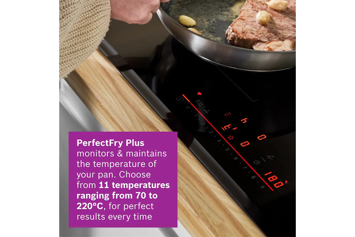 The right temperature is crucial for frying. Too high, and even the best steak will cook too quickly and scorch. With PerfectFry Plus, scorching is a thing of the past. The PerfectFry Plus sensor displays and continuously monitors your pans temperature to prevent scorching. Select from 11 predefined temperatures to suit your dish, ranging from 70 to 220°C, for perfect results every time.