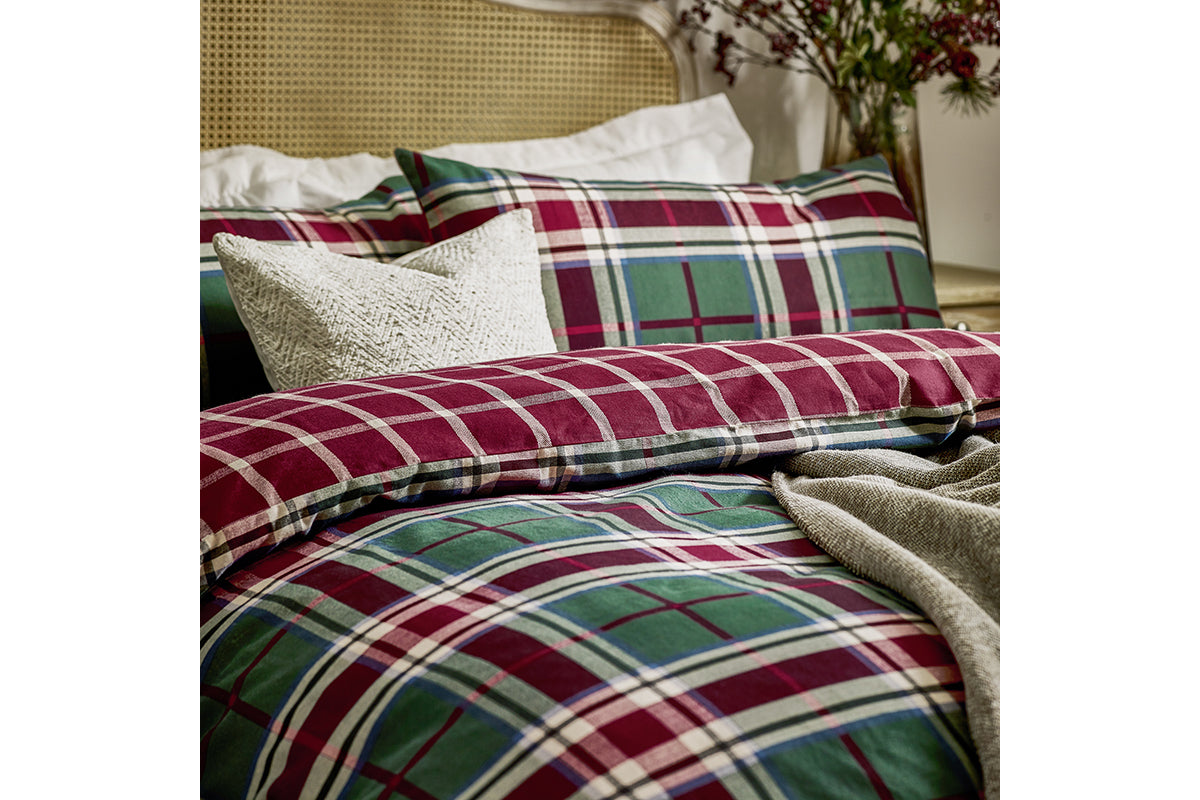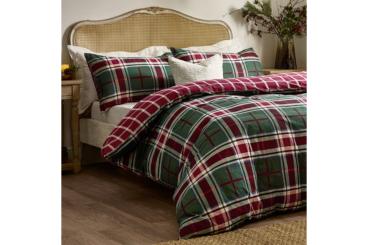Crafted from luxuriously soft, brushed cotton, this duvet set offers an irresistibly warm and comforting feel, making it the prefect addition to any bedroom on those chilly winter nights. It features a red, green, and white checked design with a simple red check reverse offering two looks in one, adding versatility to your room. This set includes one duvet set and two matching pillowcases.