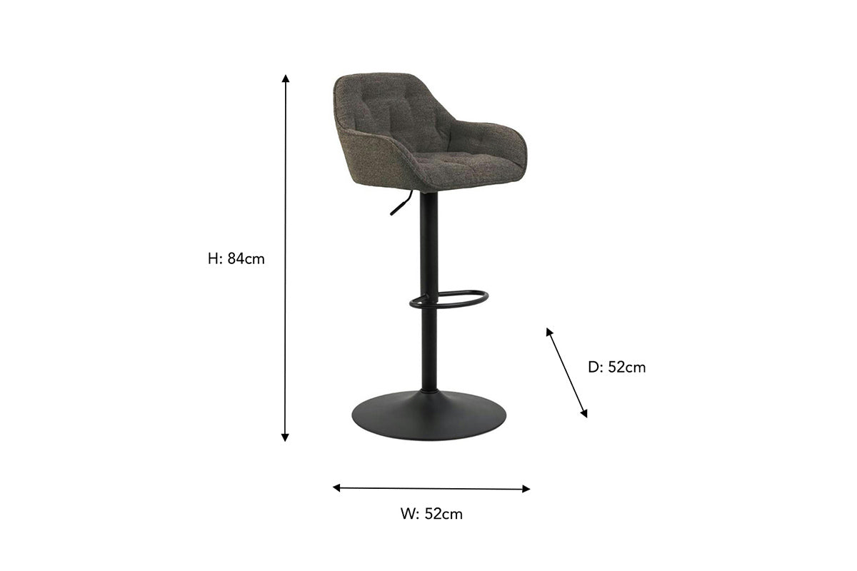 Add character to your dining area with the elegant Brooke counter stool. It has a timeless silhouette and is upholstered in soft fabric offering a rich tactile experience. Perched on round black metal centre pole and trumpet base with a rough powder coated finish that give this chair a modern look. The seat is also decorated with tufting to give it extra texture making it the perfect companion for your kitchen island or bar. It includes a gas lift making it easy to lower and raise the height.