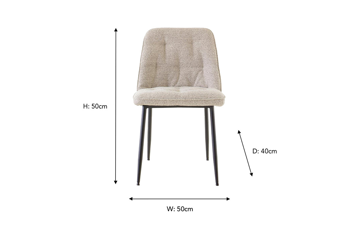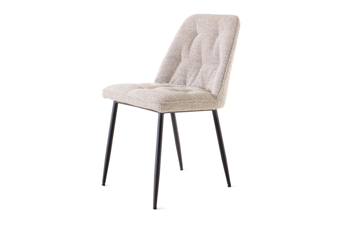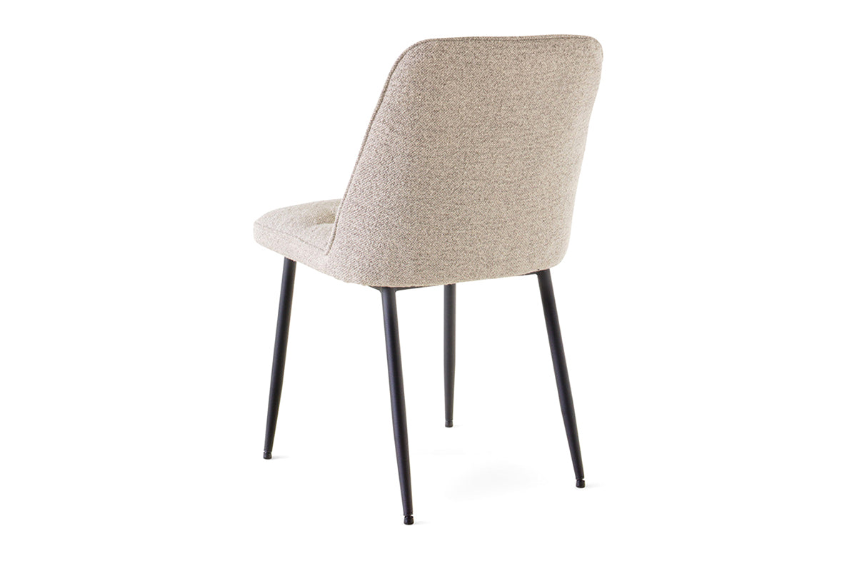 Add character to your dining area with the elegant Brooke dining chair. It has a timeless silhouette and is upholstered in soft beige fabric offering a rich tactile experience. Perched on round black metal legs with a rough powder coated finish that give this chair a modern look.