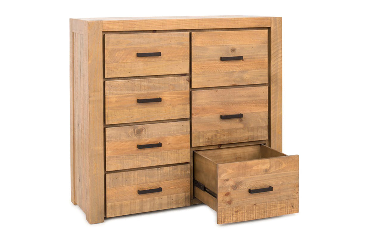 This drawer chest immediately flaunts its strength, apparent firstly in its appearance and then its build. The varying colours of the pine highlight its individual cut and also draw the eye to the finer details such as its metal handles. The perfect partner for you bed, matching furniture is also available for you to mix and match.