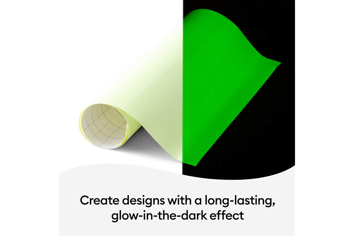 Let it all glow. With Cricut Glow-in-the-Dark Vinyl, you can add a luminous accent to your walls, accessories, seasonal decor, or whatever needs a little brightening up. The material lies flat for easy cutting, effortless weeding, and wow-worthy application. Removable vinyl lets you customize without commitment — it's durable, but removes without residue for up to 2 years. Create your design, apply to your desired surface, then just switch off the lights and get your glow on. For all Cricut cutting machines.