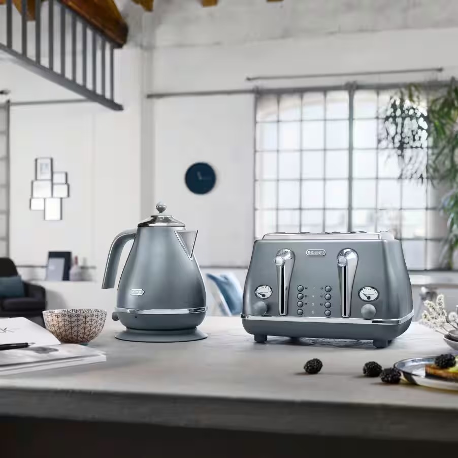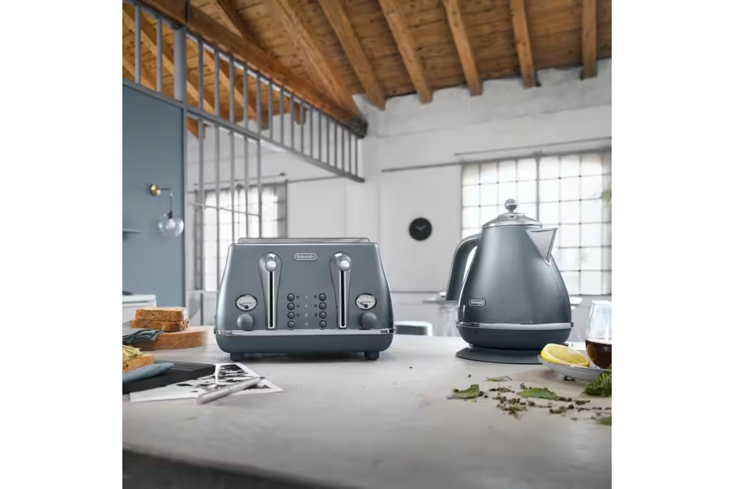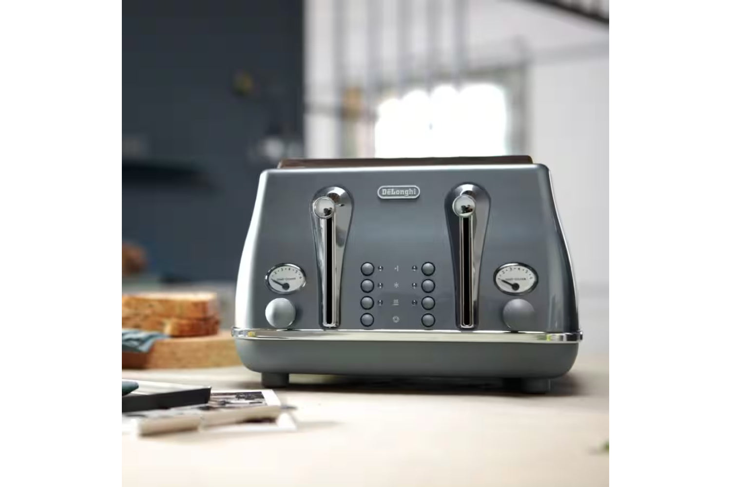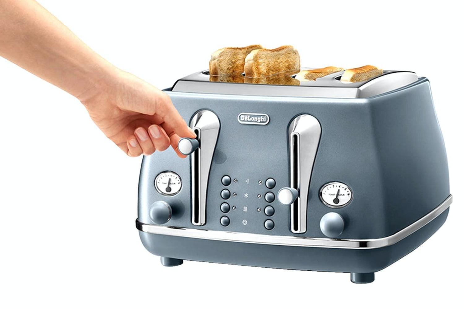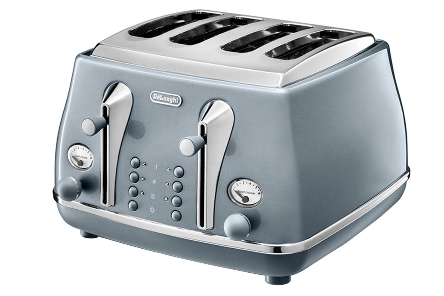 The De'Longhi Icona Metallics 4-slice toaster delivers all the convenience you need in an attractive package. Reheat, defrost and toast your bread to the preferred level using the integrated electronic controls with a 6-position progressive browning dial. The glossy azure finish of this toaster will add a tasteful splash of colour to your kitchen.