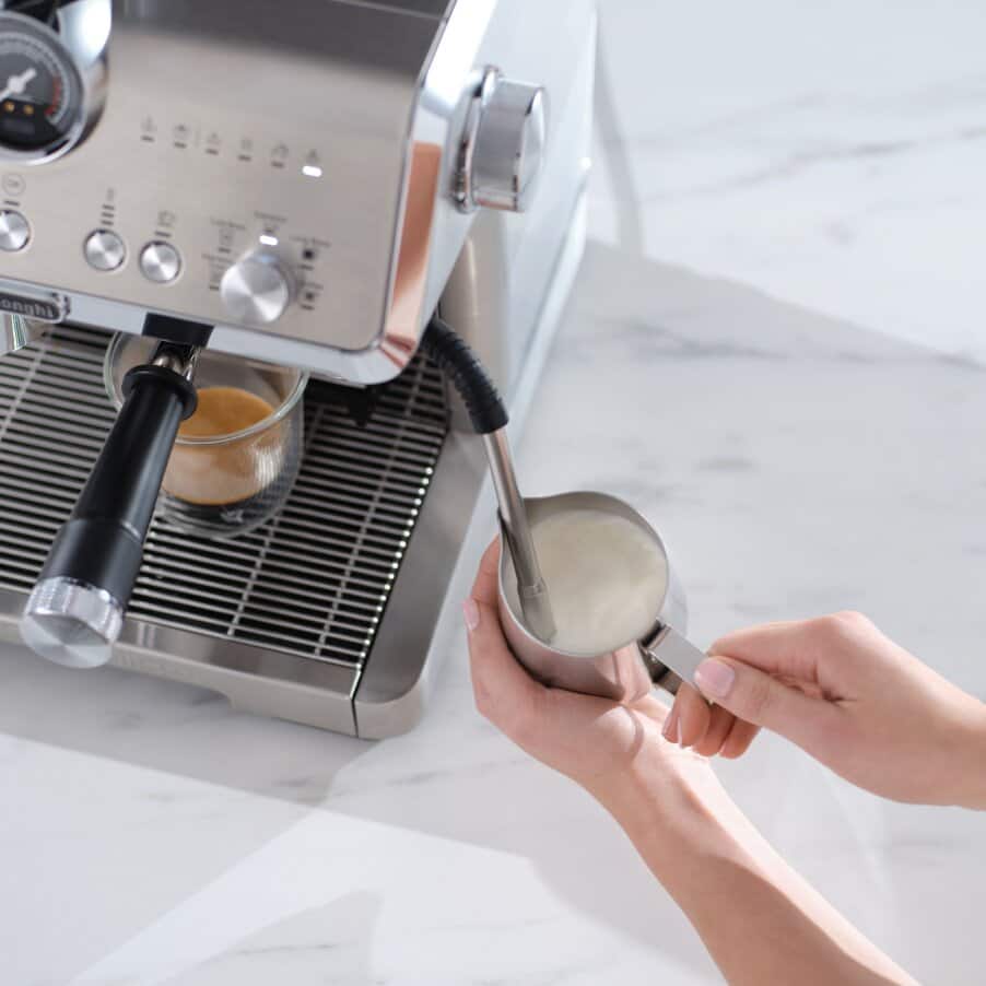 The My LatteArt steam wand creates a vortex that turns milk into silky microbubble foam for crafting latte art. The cool-touch wand is safer to handle and easier to clean.