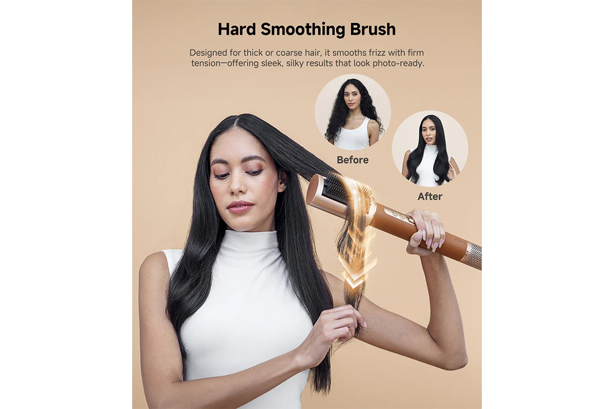 When using the smoothing brush, the airflow is automatically directed downward to enhance the hair-smoothing effect. It provides two types of comb teeth tailored to address specific hair types and conditions.