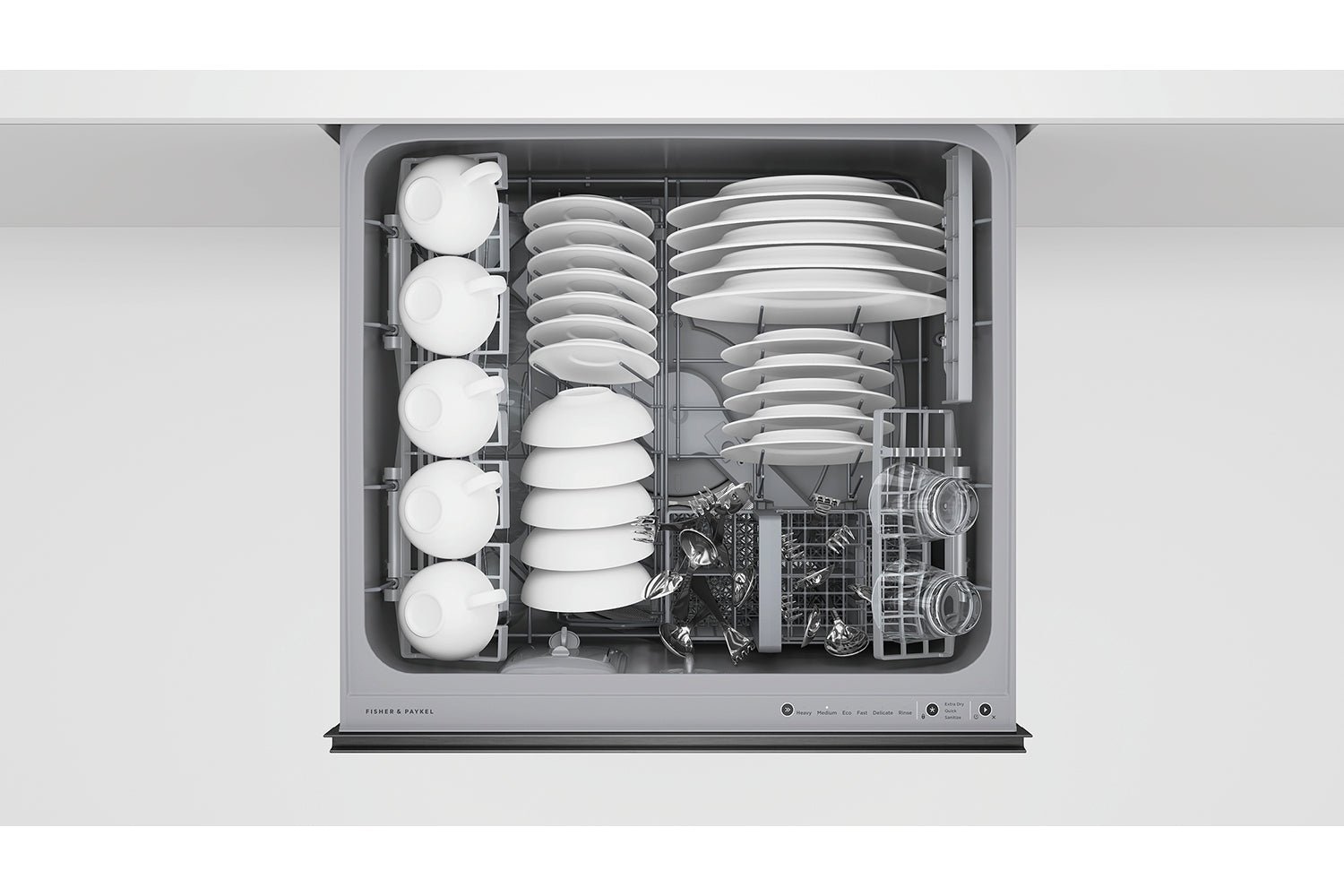 Wash one drawer while you load the other, with room in each drawer for full-size dinner plates.