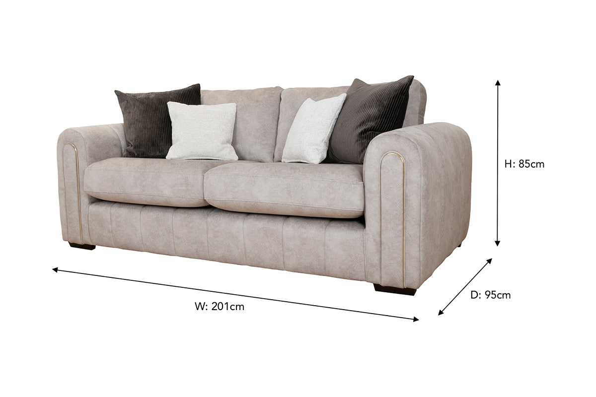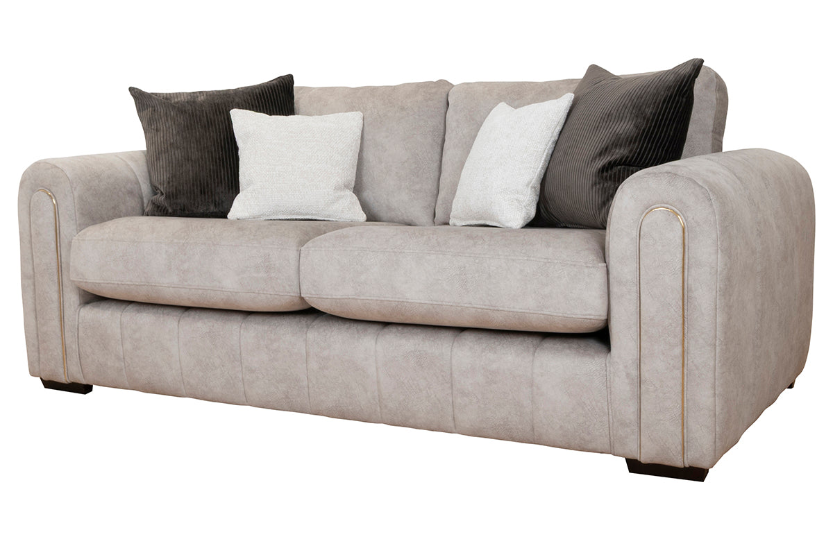 Sink into the inviting embrace of the Glamour 3-seater, whose generously cushioned foam seat offers lasting support, while the plush fibre backing ensures a cosy feel at the end of a long day. Finished with solid wooden feet for a sturdy foundation and subtle sophistication. This sofa also features luxurious piped detailing along the front, and you can choose from three piping colours to match of contrast with your fabric choice for a more personalised touch. The linear design across the front and arms adds a gentle layer of texture, completing the refined look.