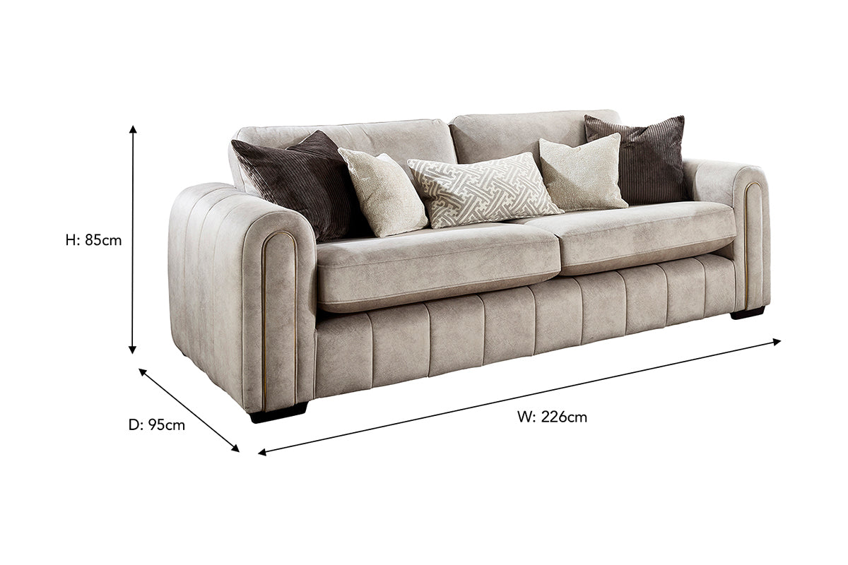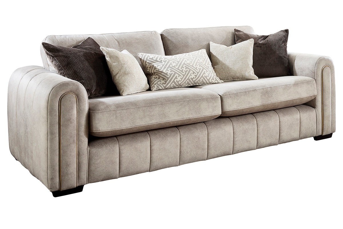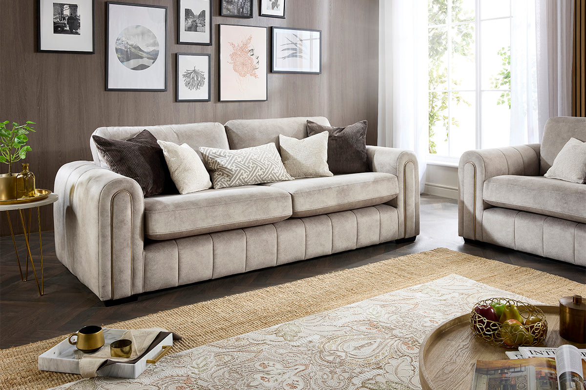 Sink into the inviting embrace of the Glamour 3-seater, whose generously cushioned foam seat offers lasting support, while the plush fibre backing ensures a cosy feel at the end of a long day. Finished with solid wooden feet for a sturdy foundation and subtle sophistication. This sofa also features luxurious piped detailing along the front, and you can choose from three piping colours to match of contrast with your fabric choice for a more personalised touch. The linear design across the front and arms adds a gentle layer of texture, completing the refined look.