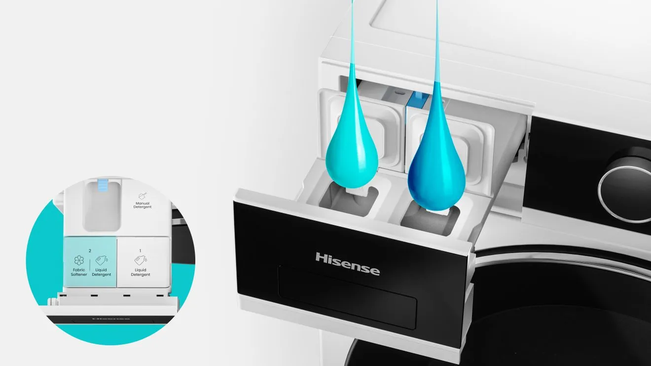 Hisense advanced auto dosing system adjusts detergent based on laundry weight and wash programme for optimal cleaning with less waste. With a capacity to hold enough liquid for up to 27 washes*, it offers hassle-free convenience. Now with an innovative upgrade, the fabric softener compartment converts into an extra detergent compartment for greater capacity and fewer refills. This smart system enhances performance while promoting sustainability, making every wash more efficient and eco-friendly. *Based on the average of 5kg load/medium soil level. Actual results may vary depending on individual use, the washing load and settings.