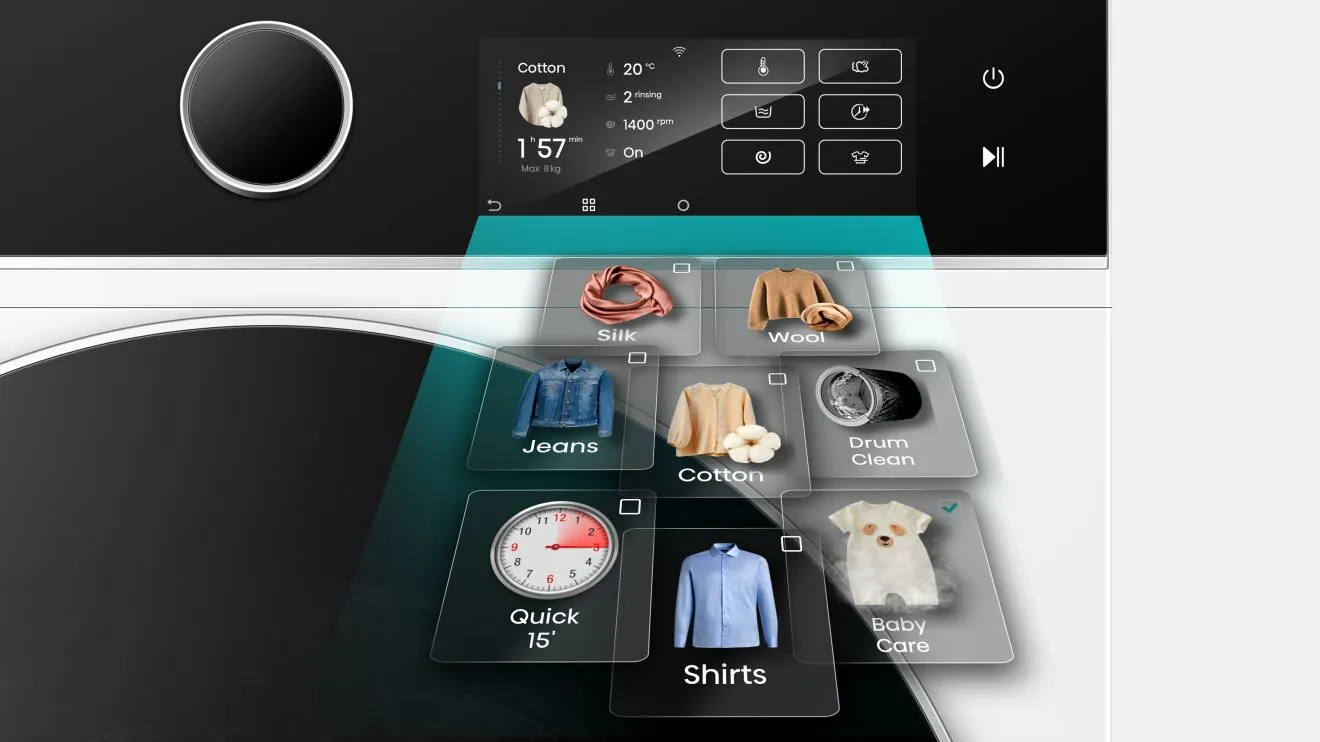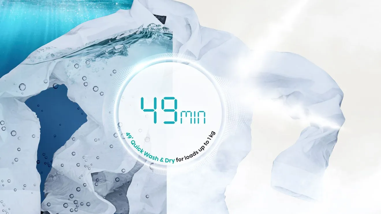 The Wash and Dry 49' programme completes a full wash and dry cycle for 1kg of laundry in just 49 minutes, saving time and energy without compromising performance. Perfect for last-minute outfit refreshes or everyday essentials, it optimises efficiency while reducing water and electricity usage, making it a fast, convenient and eco-friendly choice.