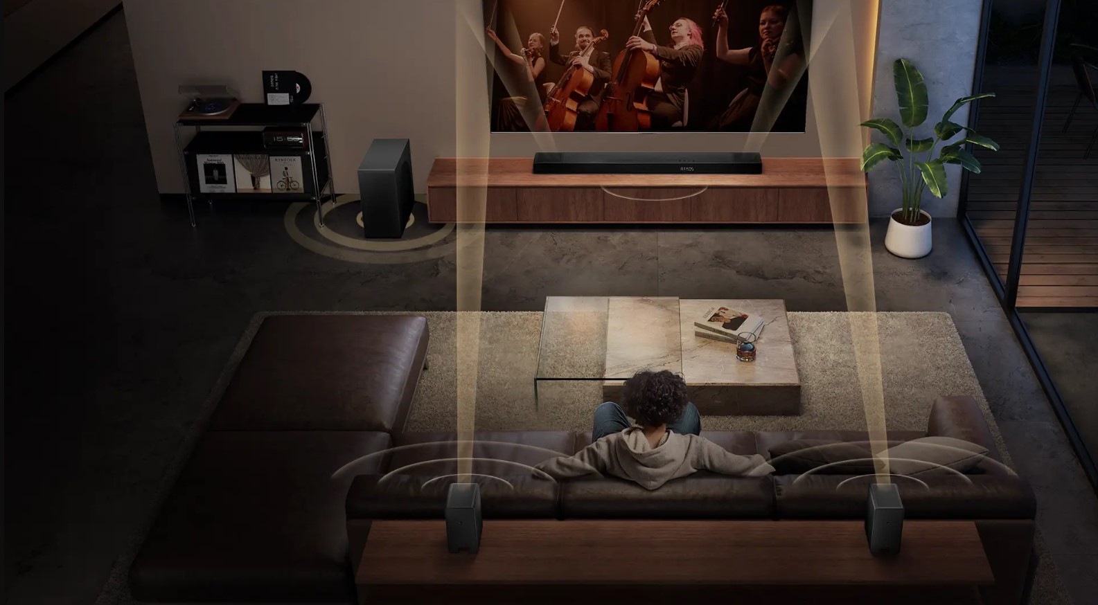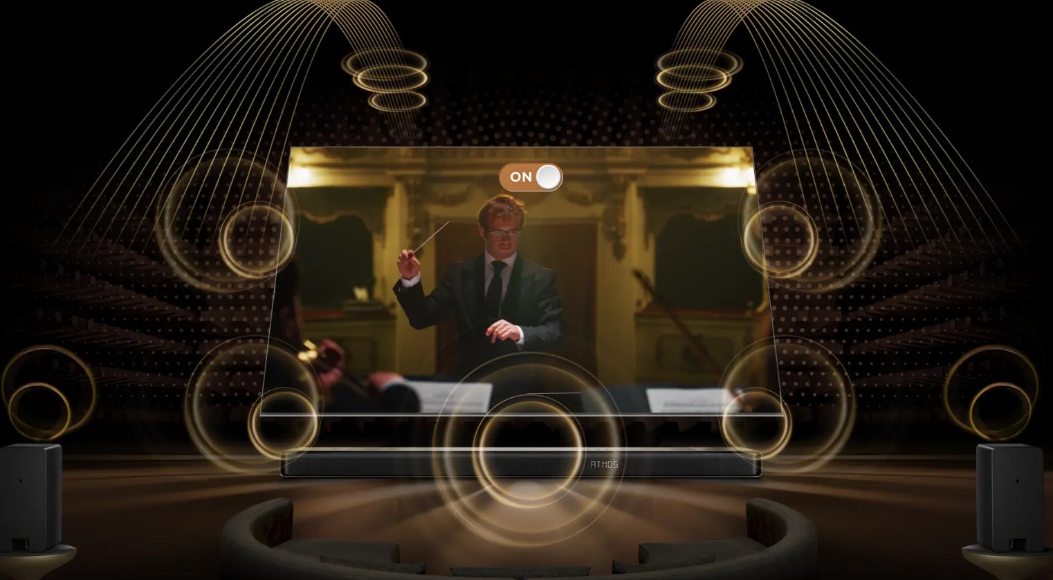 Immerse in 360-degree sound with wireless rear surround featuring 2 up-firing speakers. Experience true surround that envelops you from above and around.