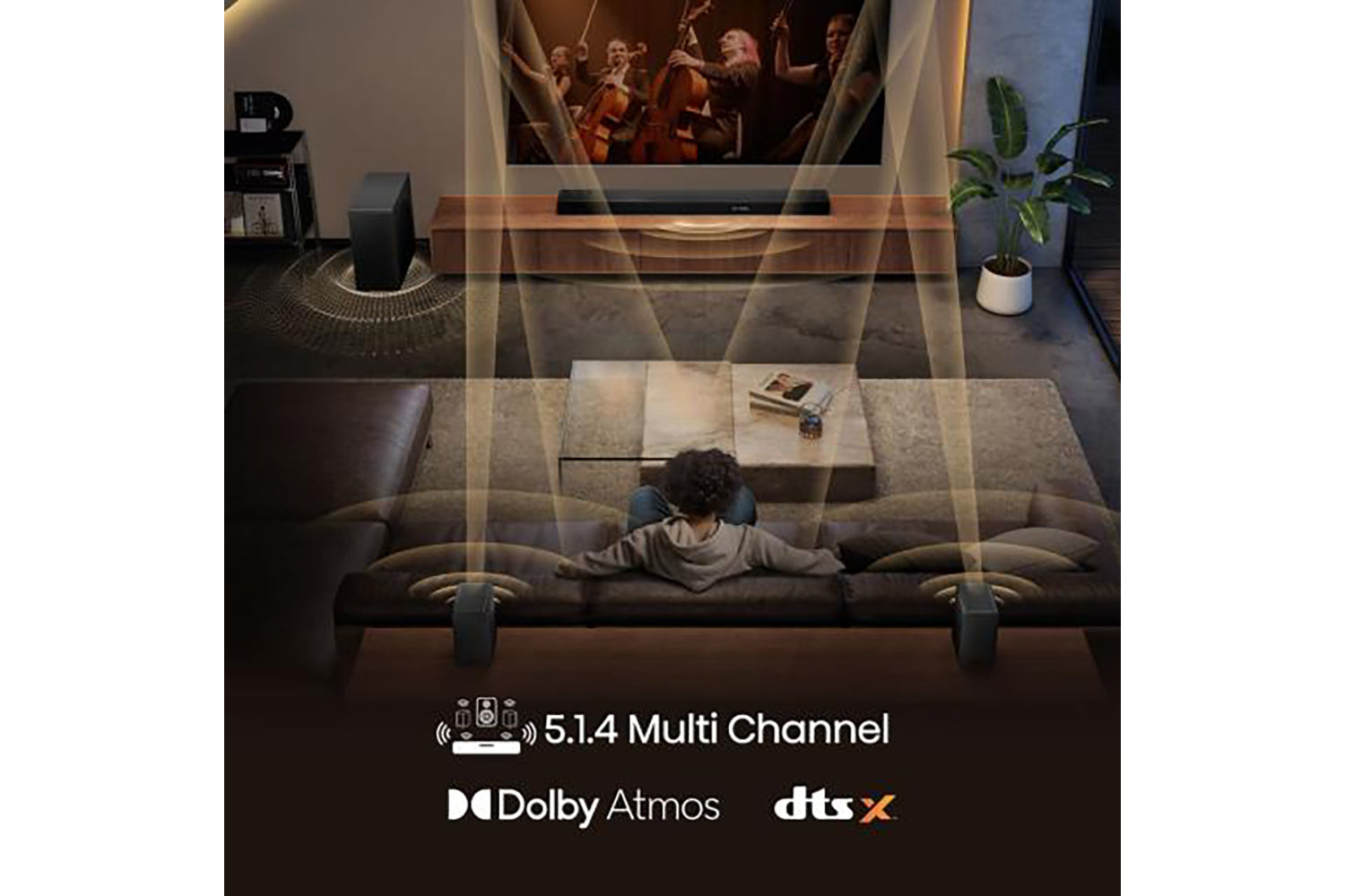 Step into the immersive world with 5.1.4 channel surround sound featuring dolby atmos and dts:x. 4 up-firing speakers create a captivating audio oasis, delivering 360-degree sound wraps around you from every direction.