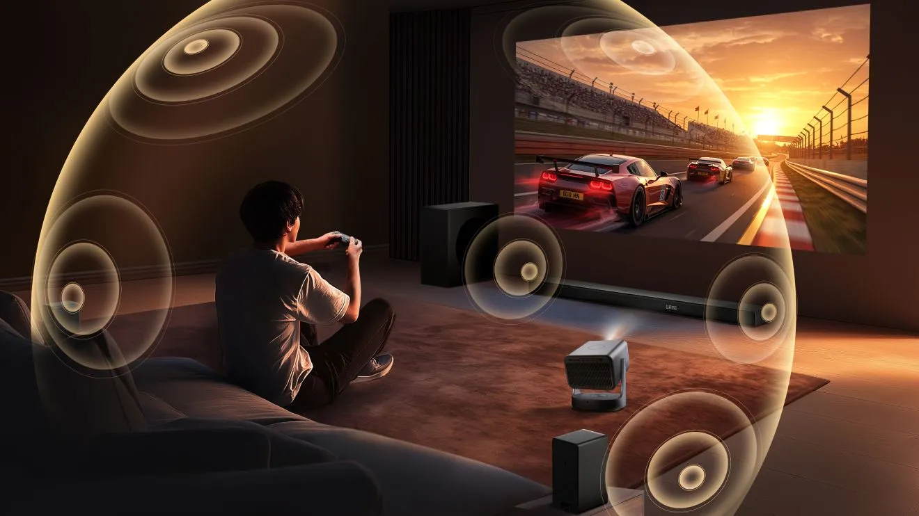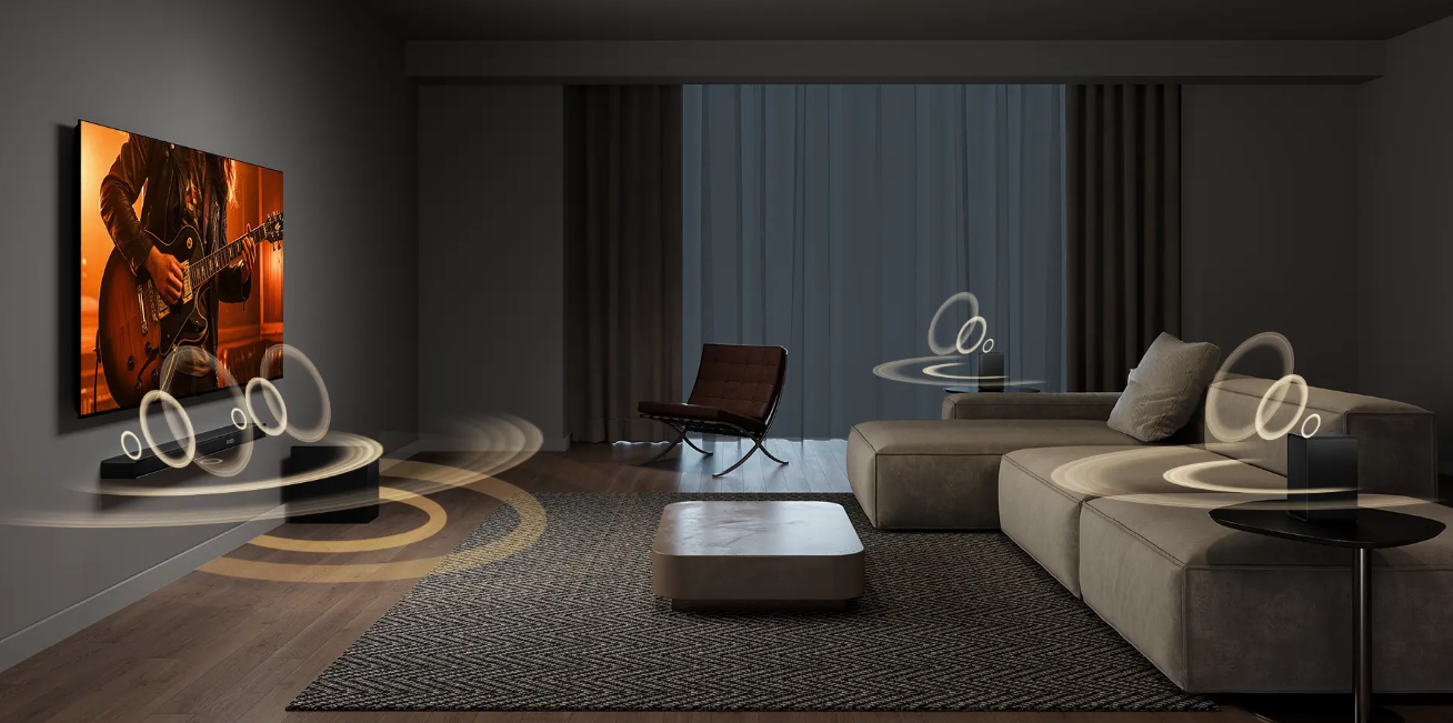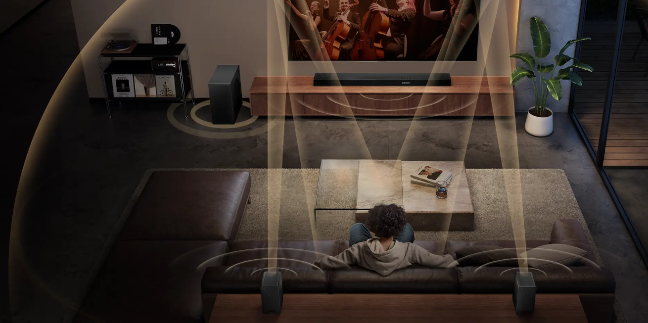 Step into the immersive world with 5.1.4 channel surround sound featuring Dolby Atmos and DTS:X. 4 up-firing speakers create a captivating audio oasis, delivering 360-degree sound wraps around you from every direction.