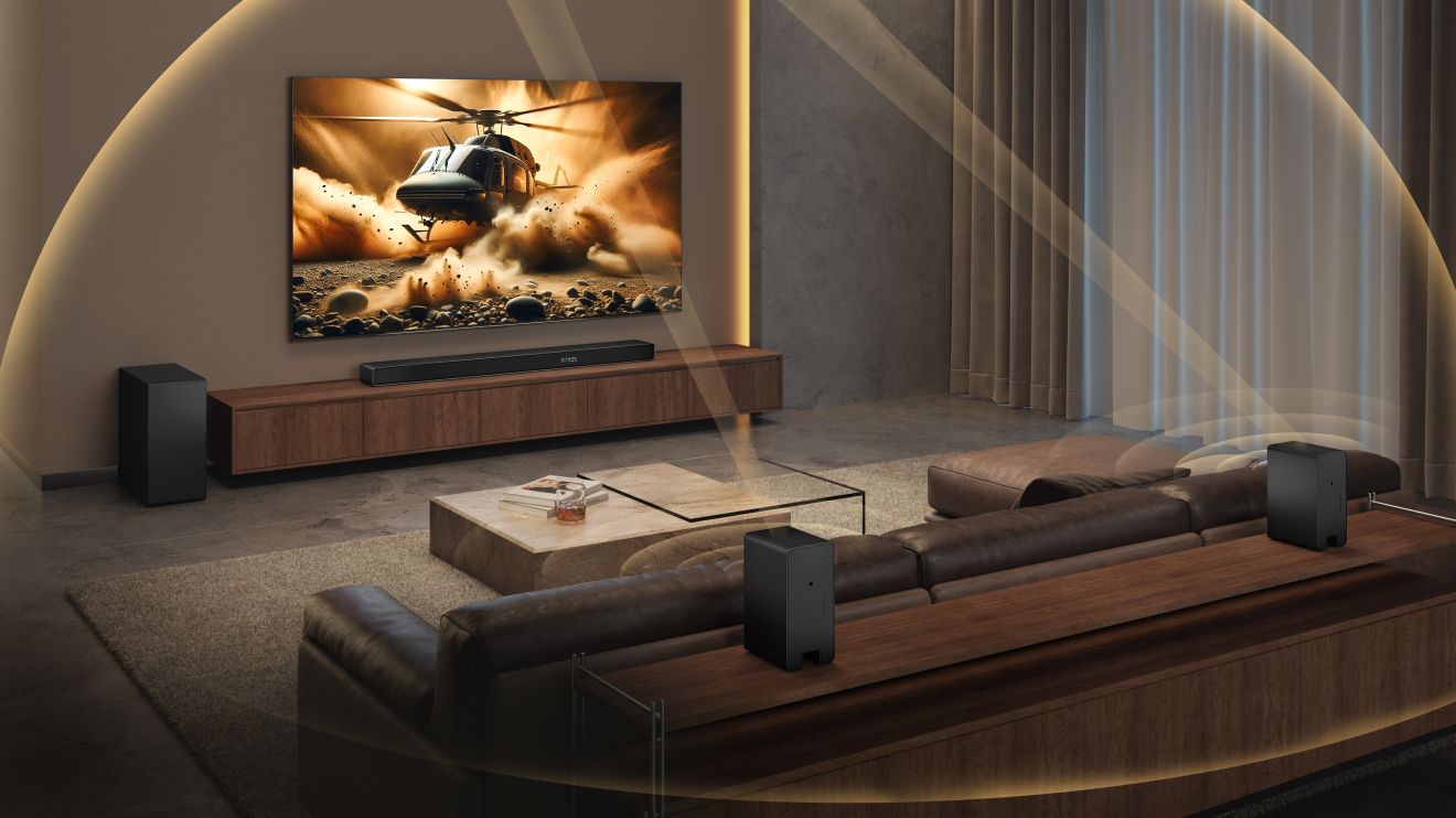 Immerse in 360-degree sound with wireless rear surround featuring 2 up-firing speakers. Experience true surround that envelops you from above and around.
