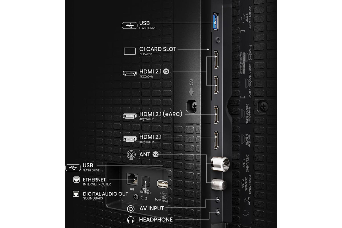 Newest consoles, faster data transmission and lower lag. Add all external devices with state of the art wireless and wired connectivity. Full HDMI 2.1, USB 3.0, AirPlay, Bluetooth, and Share to TV.