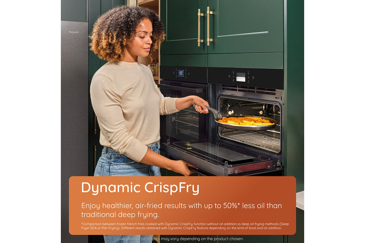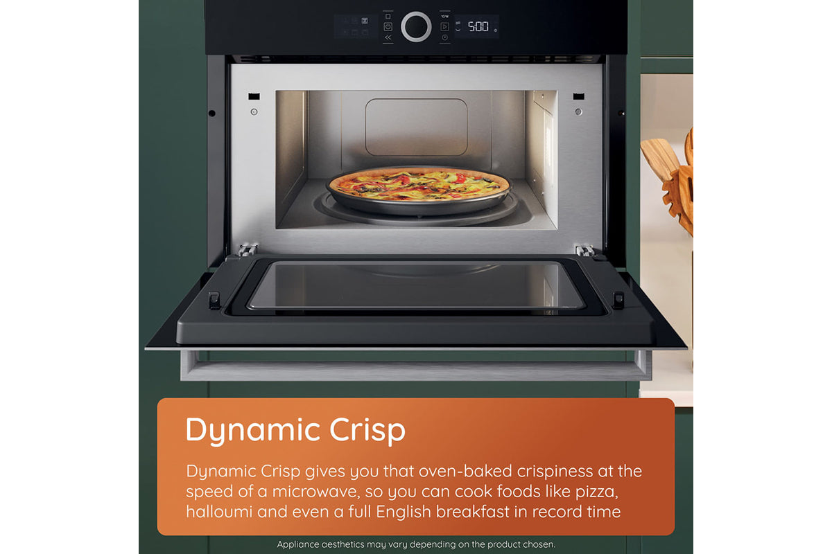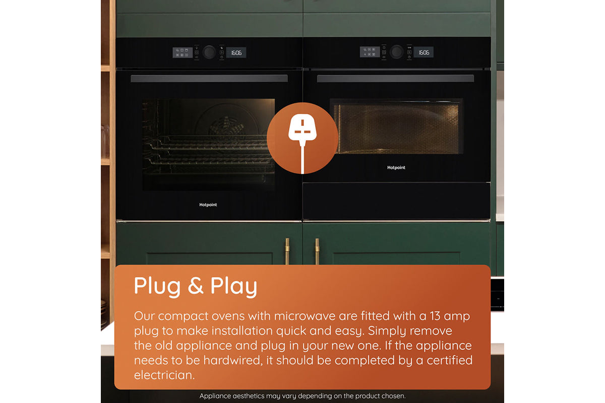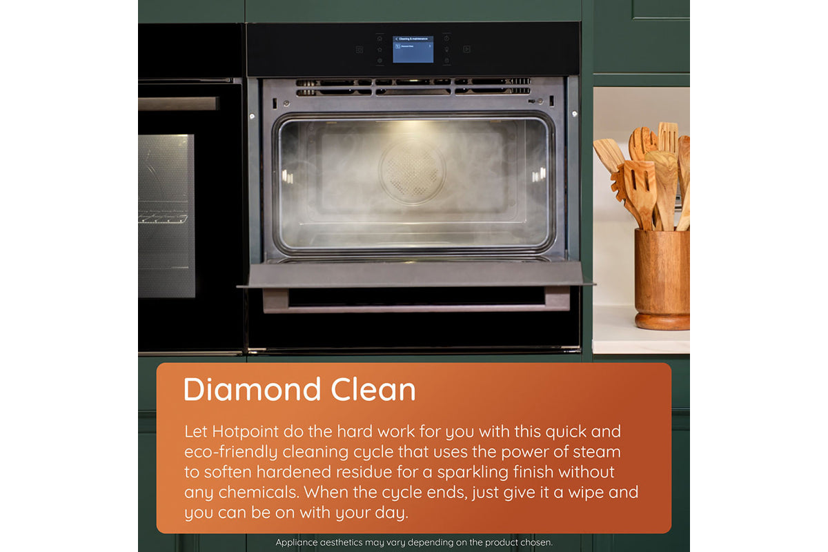Maximise your kitchen space with the hotpoint 45cm class 6 compact oven, designed for versatility and energy efficiency. With a sleek black finish and intuitive mono dial control, it adds both style and functionality to any kitchen. This space-saving oven features a 950w microwave and 8 cooking functions, perfect for reheating, steaming, baking, grilling, and crisping—ensuring exceptional performance for flawless meals every time. Thanks to cook 3 technology, the 53L cavity features 3 cooking levels, allowing you to prepare a full family meal at once, without any flavour transfer. It saves up to 43% in energy and 61% in cooking time*. Streamline your cooking with integrated crisping functions. Choose dynamic crispfry for healthier, air-fried results on fresh or frozen foods like french fries or fried chicken, using up to 50%** less fat. Or select dynamic crisp for oven-baked crispiness at microwave speed, perfect for pizza, halloumi, or even a full english breakfast in minutes. For those who prefer healthier, flavour-packed meals, gentle steam technology locks in moisture and nutrients. Simply add water to the dedicated recess and choose from 3 steam settings, ideal for bread, fish, and succulent meats. Cooking has never been simpler. Mymenu automatically selects the optimal settings for various dishes, making it your perfect kitchen assistant. For easy cleaning, the eco-friendly diamond clean cycle uses steam to soften residue, allowing it to be easily wiped away. A soft-closing door adds a final touch of luxury to the oven’s premium design. *Comparing cooking tart, lasagna, chicken drums with roasted potatoes on 3 levels simultaneously vs cooking same dishes in 3 separate runs.**Comparison between frozen french fries cooked with dynamic crisp fry function without oil addition vs deep oil frying methods (deep fryer SDA or pan frying). Different results obtained with dynamic crisp fry feature depending on the kind of food and oil addition.