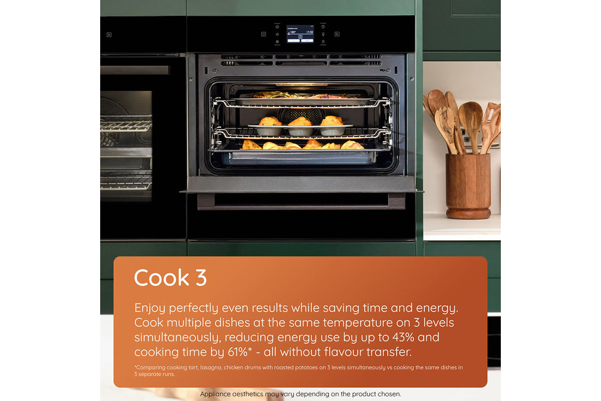 Enjoy perfectly even results while saving time and energy. Cook multiple dishes at the same temperature on 3 levels simultaneously, reducing energy use by up to 43% and cooking time by 61%* - all without flavour transfer.