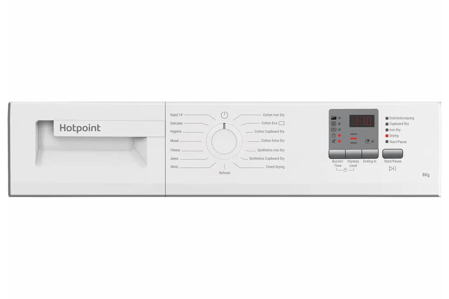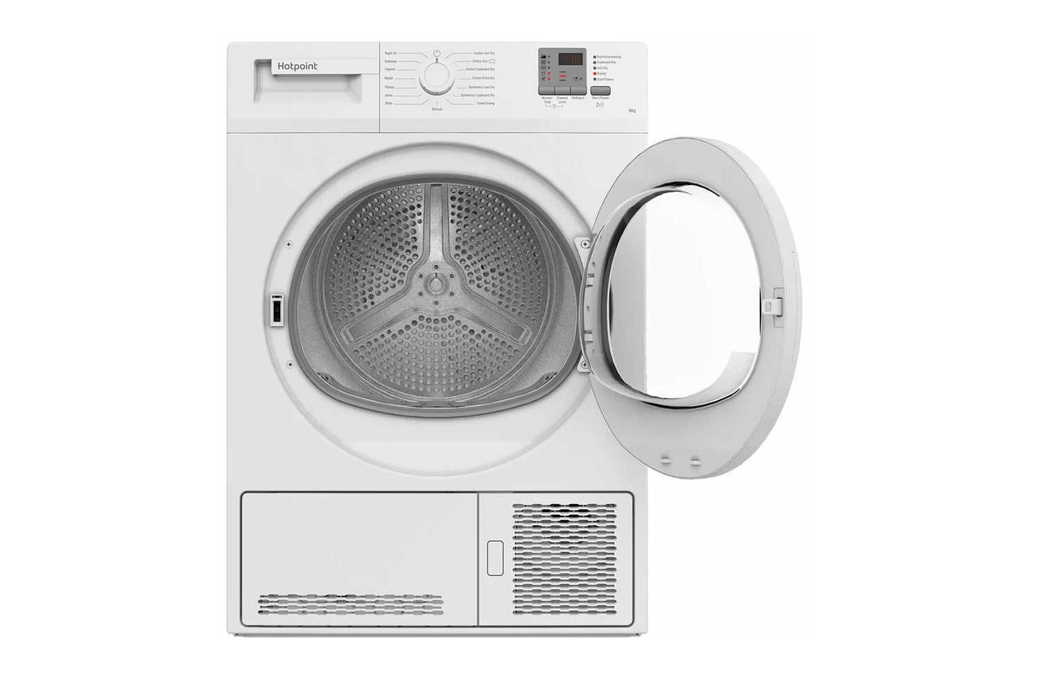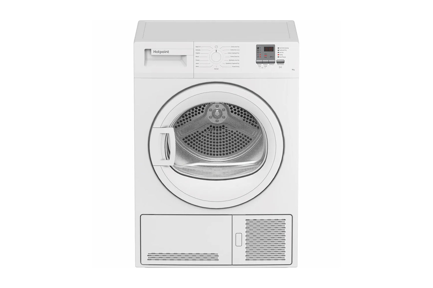 This Hotpoint Condenser Tumble Dryer in pristine white combines a large 8kg drying capacity with an efficient B energy rating to help save you money. It features a single dial for easy selection of 15 drying cycles, while the digital display lets you keep track of the progress. When you really need that outfit, the Rapid Cycle will have it dry in just 14 minutes, so there's no waiting around when time isn't on your side. You can also hit the Refresh Cycle when you want to quickly freshen up clothes that have been sitting in the tumble dryer for a while, helping remove any stale odours.