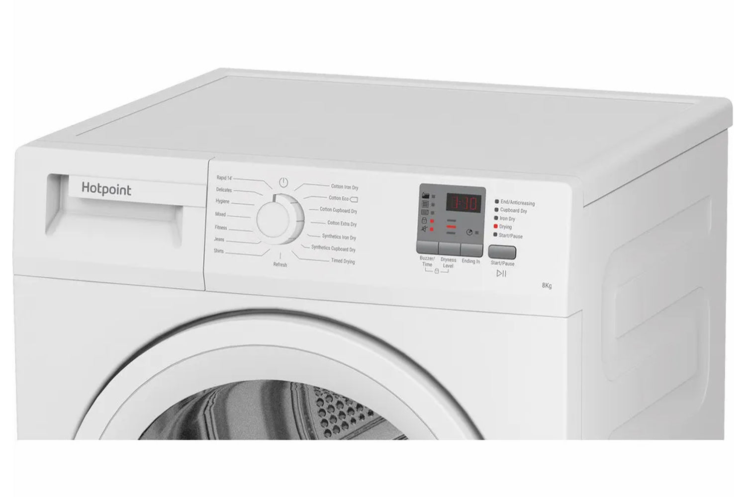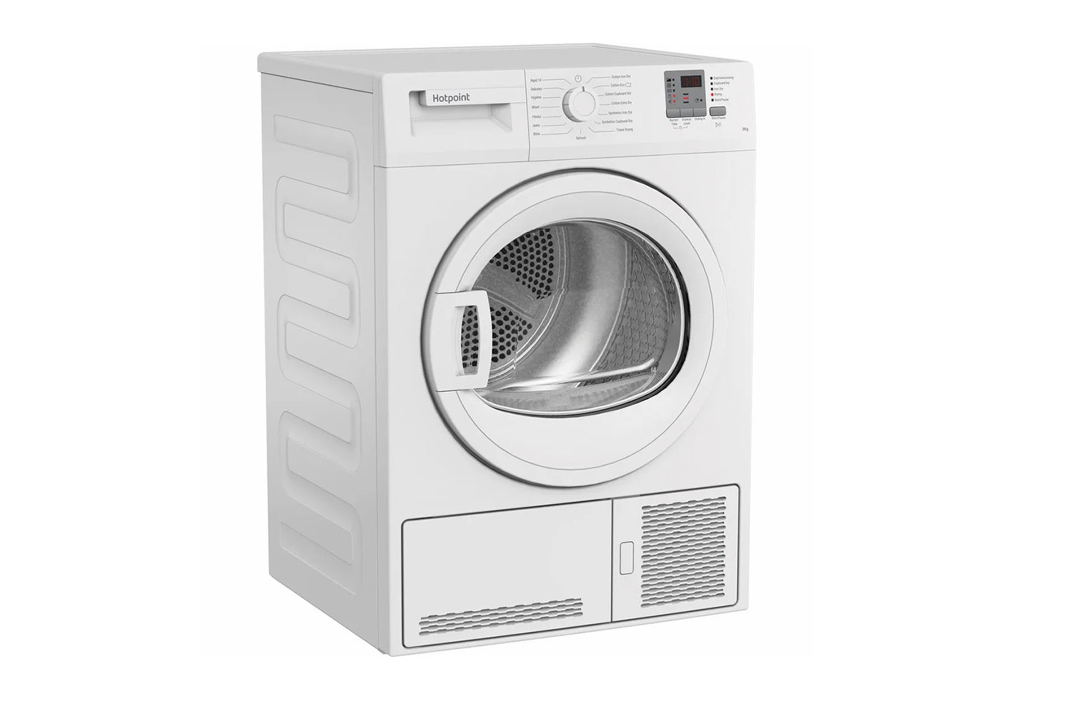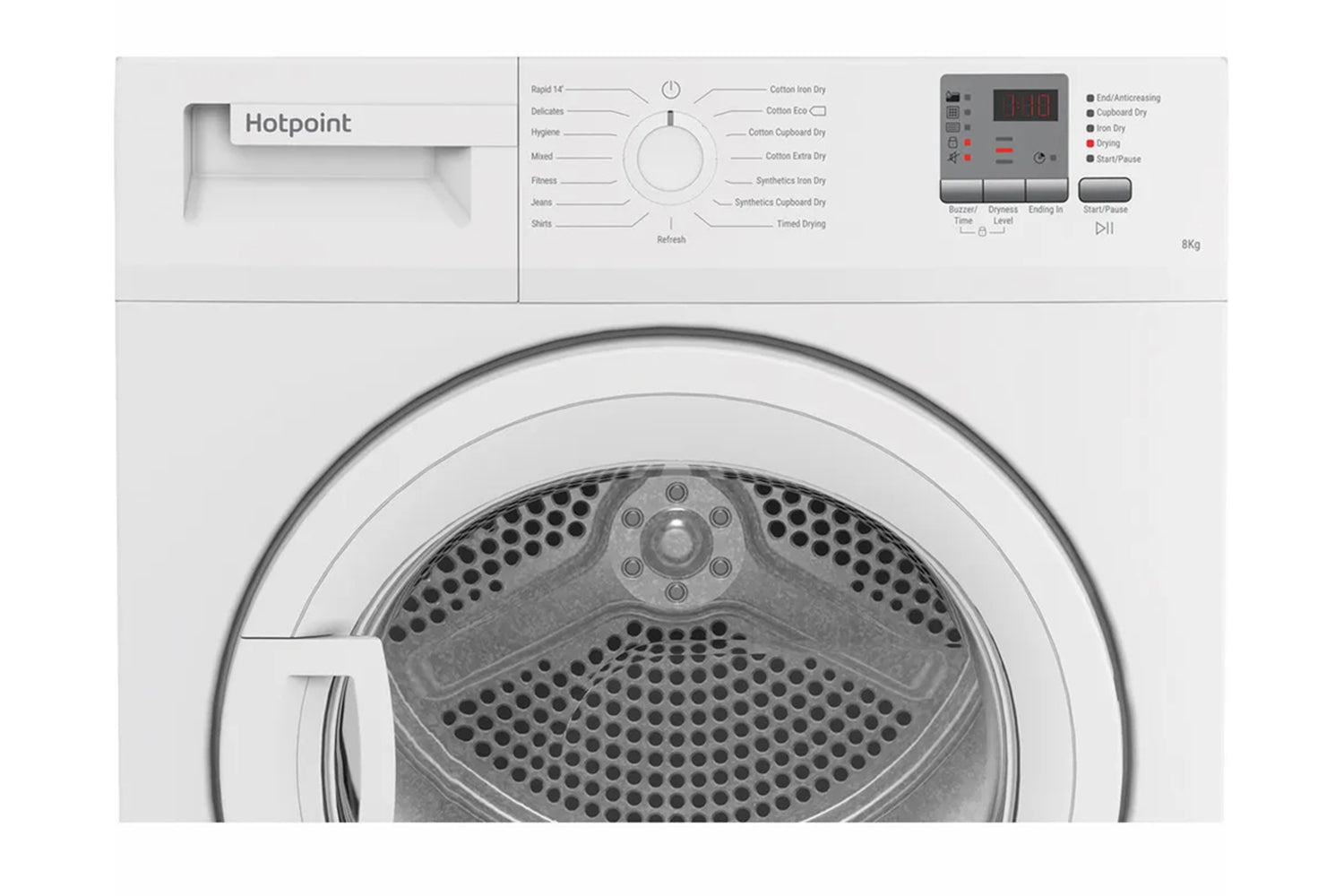 This Hotpoint Condenser Tumble Dryer in pristine white combines a large 8kg drying capacity with an efficient B energy rating to help save you money. It features a single dial for easy selection of 15 drying cycles, while the digital display lets you keep track of the progress. When you really need that outfit, the Rapid Cycle will have it dry in just 14 minutes, so there's no waiting around when time isn't on your side. You can also hit the Refresh Cycle when you want to quickly freshen up clothes that have been sitting in the tumble dryer for a while, helping remove any stale odours.