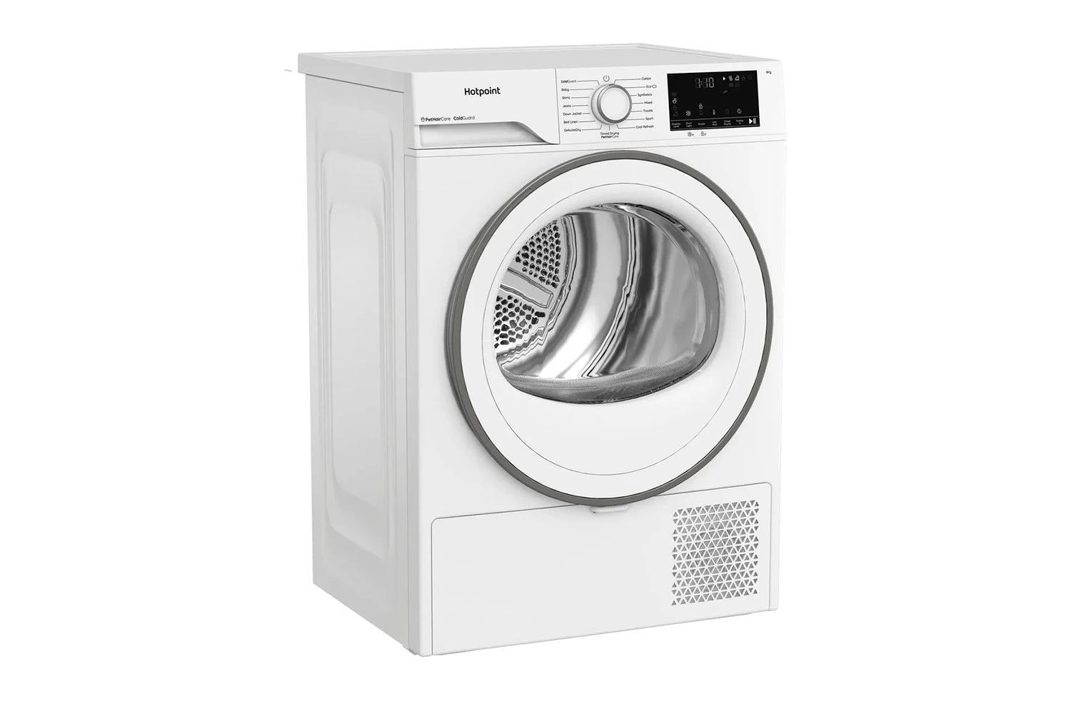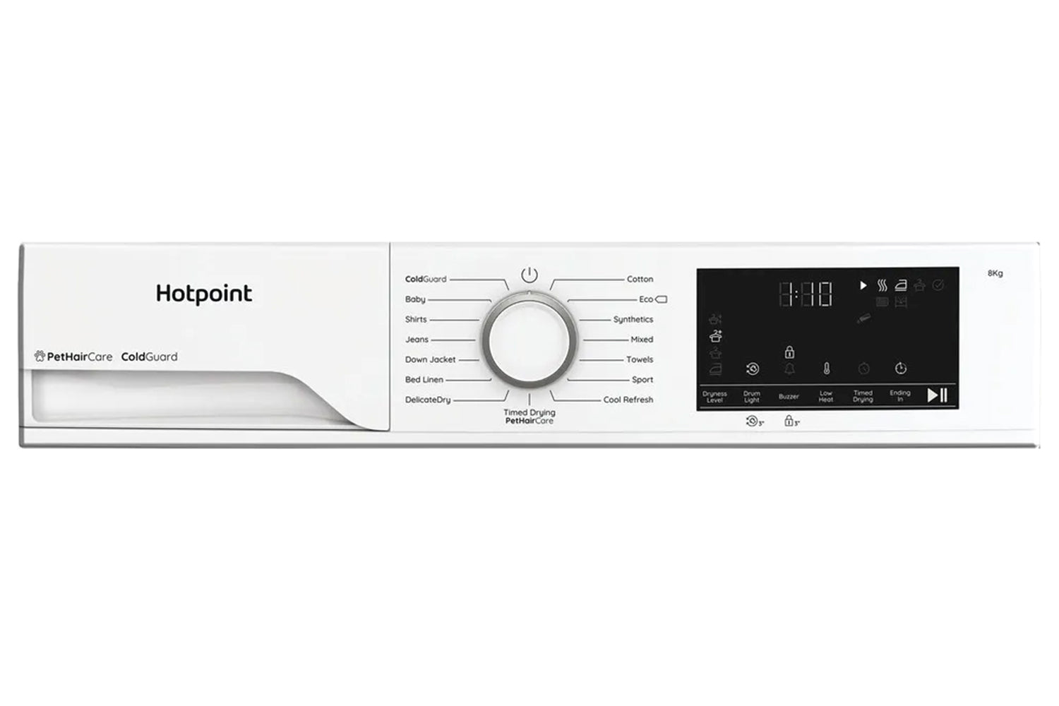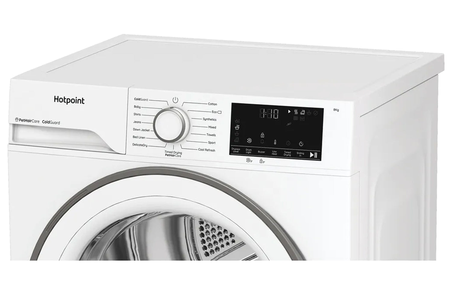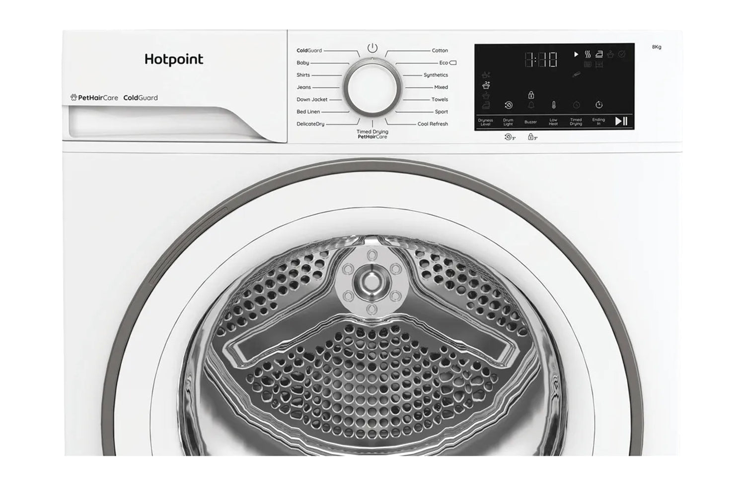 Keep your clothes looking their best, come rain or shine, with this Hotpoint heat pump tumble dryer. Finished in classic white to suit any home, it has a family-friendly 8kg capacity to get those big loads dry with ease. Thanks to energy-efficient Heat Pump technology, your clothes are dried gently at lower temperatures - using up to 77% less energy while helping to protect fabrics and reduce your bills. A must-have for any pet-loving home, the dedicated PetHairCare cycle uses a burst of steam to relax fibres and reduce static, helping pet hair lift away and get trapped in the filter - so laundry comes out fresh, clean, and hair-free. For clothes that need a gentle touch, DelicateDry uses lower temperatures to help protect fabrics so they stay looking their best for longer. Maintenance is simple too. The Easy Clean Filter combines the lint and condenser filters into one, built right into the door. It catches even the tiniest bits of fluff, and with a quick clean, your dryer stays running smoothly. And if you're short on indoor space, this model is designed to work efficiently in temperatures as low as 0°C, making it a great fit for garages and outbuildings. *Compared to condenser tumble dryers of B energy class.