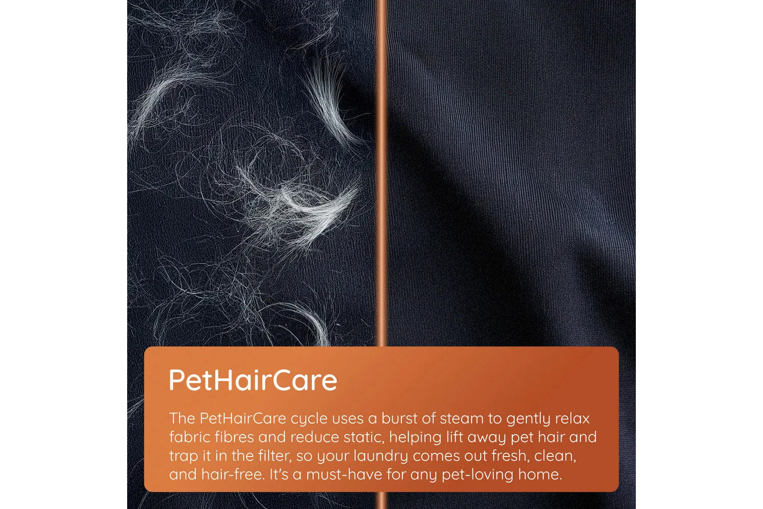 The PetHairCare cycle uses a burst of steam to gently relax fabric fibres and reduce static, helping lift away pet hair and trap it in the filter, so your laundry comes out fresh, clean, and hair-free. It's a must-have for any pet-loving home.