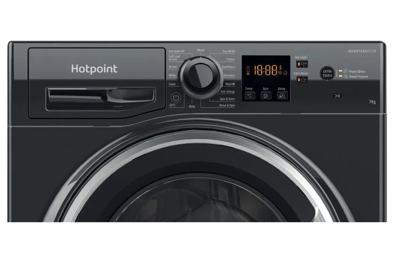 This Hotpoint Anti-stain Washing Machine in black has a good-sized 7kg capacity with a 1400 revolutions per minute spin speed. Rated A for energy efficiency means you'll achieve impeccable cleaning results while minimising energy usage and saving money on your bills. Say goodbye to stains and pre-treatment with the Anti-stain programme. This one-hour, 40°C cycle removes common, everyday stains without the need to pre-treat your clothes. The Full Load 45' programme allows you to wash a full load of laundry in just 45 minutes without compromising on cleaning performance, so you can get that mountain of washing done in no time. When time isn't on your side, the Rapid option lets you reduce the wash duration by up to 50%*, so there's no waiting around for your much-needed items. You can also remove up to 99.9%** of bacteria from your laundry, thanks to the high-temperature Anti-allergy cycle. So, if you suffer from allergies or sensitive skin, trust Hotpoint to help. * the % will vary according to load & programme selected.