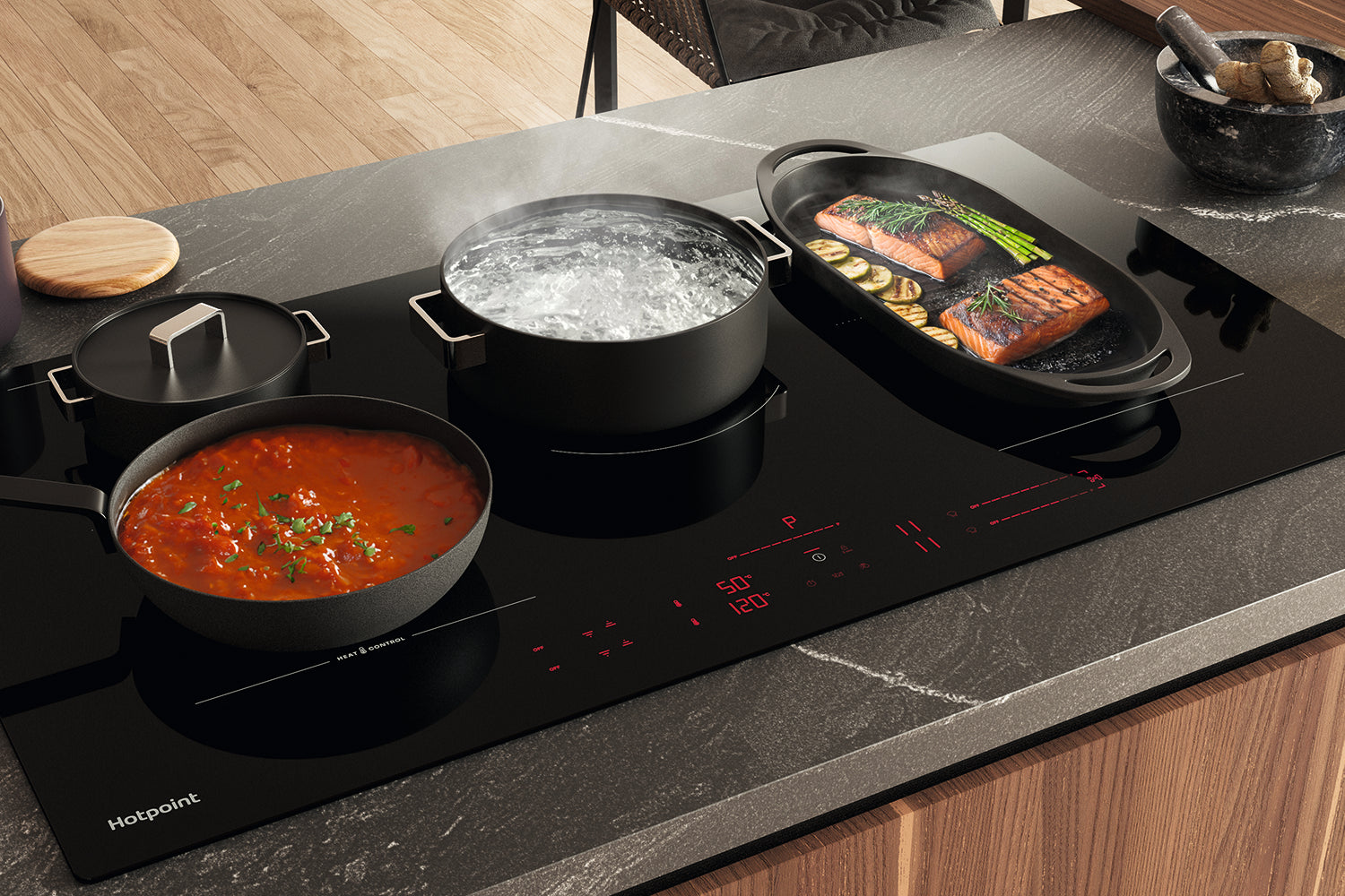 Discover a more enhanced and intuitive way of cooking with this Hotpoint HeatControl 90cm induction hob. Crafted with a sleek black finish and a discreet display that disappears when not in use, it gives you a stylish, minimalistic look while delivering consistently flawless results every time. Hotpoint innovative HeatControl technology allows you to set a precise temperature, meaning there's no need to constantly adjust the heat or keep an eye on your pots. Like an oven, the hob maintains a stable temperature, helping to prevent burning or boiling over - so you can enjoy cooking your culinary creations with ease. If you prefer, you can also cook using traditional power levels, with 18 to choose from. The unique CleanProtect nano-coating shields the hob's surface from halos, marks and chips, making it super easy to keep spotless using just water*. And the dedicated FlexiZone with HeatControl lets you combine two cooking zones, giving you extra flexibility for larger pots along with a consistent and stable temperature across the entire surface. When you're in a hurry, FastBoil quickly brings water to boiling temperature with just one touch, while Boost Power helps get thicker sauces boiling in no time. The BoilControl function will also get your water boiling but prevents it from spilling over by automatically adjusting the temperature, which is handy if you get distracted. For extra safety, this hob includes some thoughtful features. The Residual Heat Indicators light up when the hob is still hot, while the handy Child Lock prevents little hands from adjusting the controls - perfect for a busy family home.