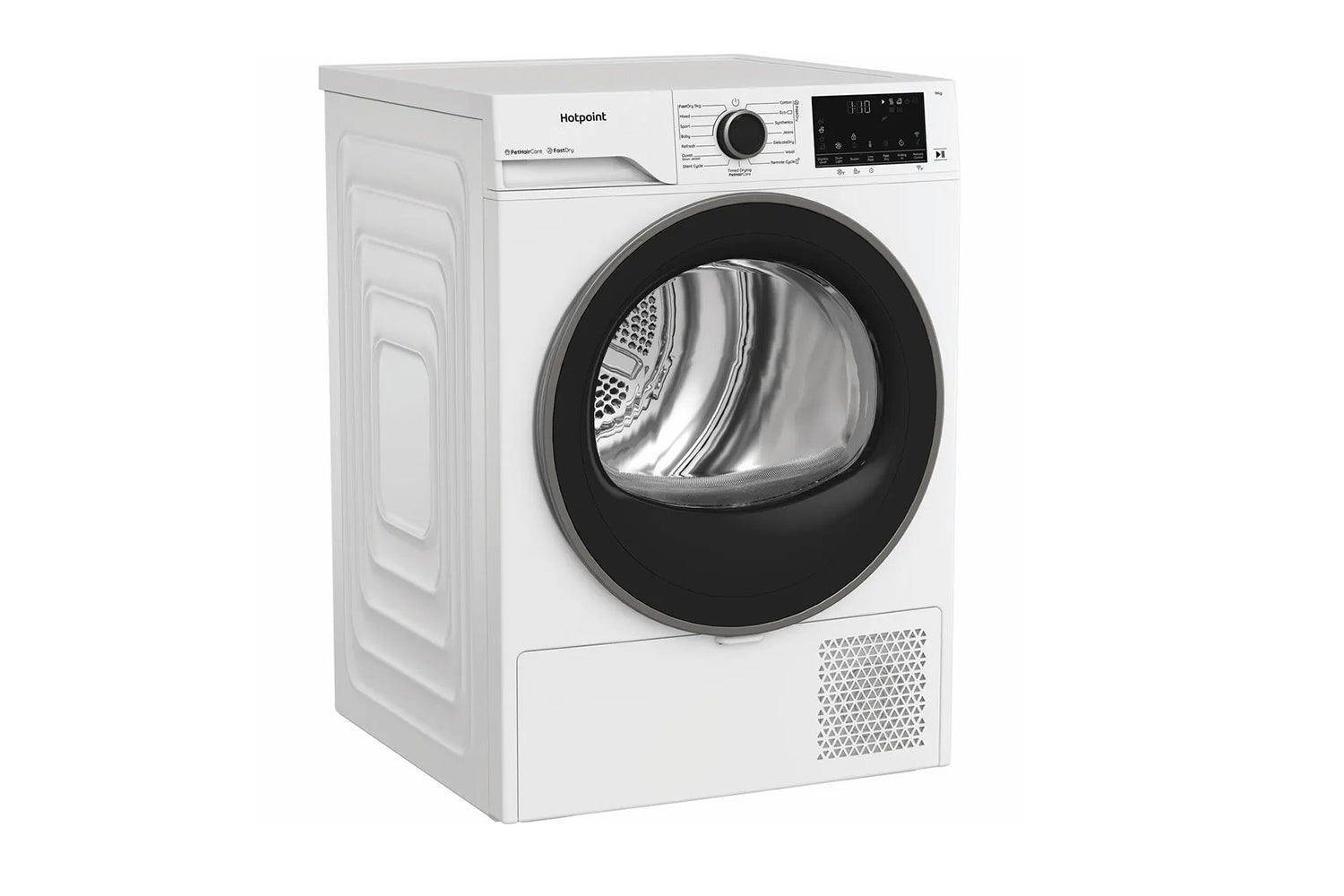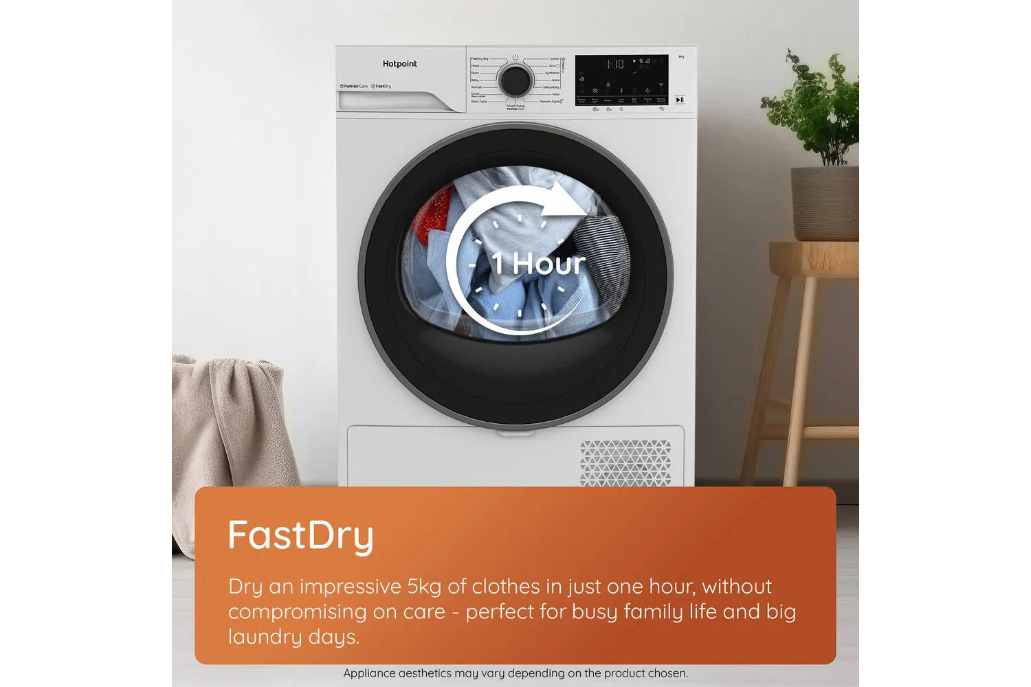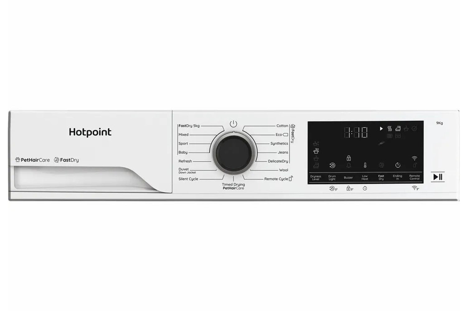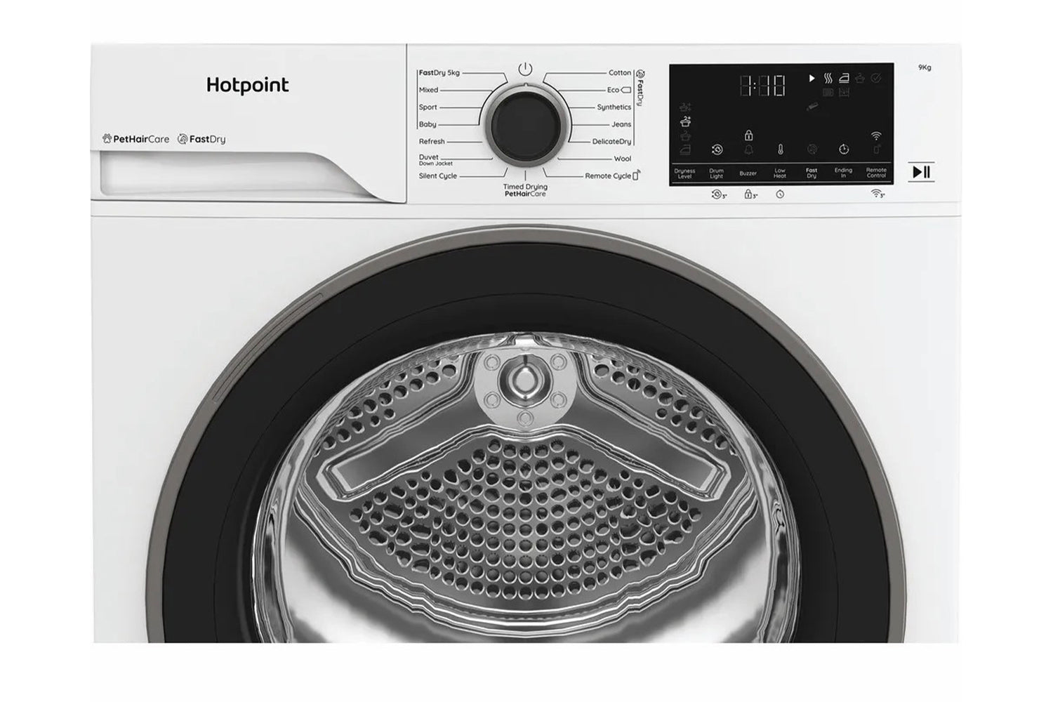 Make light work of laundry day with this white Hotpoint heat pump tumble dryer. Featuring a generous 9kg drum, you can dry bigger loads in one go - making it perfect for busy families. Heat Pump technology delivers powerful drying with up to 77% less energy use*, all while being gentle on your clothes. If you’ve got pets, you’ll love the PetHairCare cycle. A burst of steam softens fibres and cuts static, helping to lift stubborn pet hair and trap it in the filter, leaving your laundry fresh and clean. And when your clothes need a little extra care, the DelicateDry cycle will look after your clothes so they stay their best for longer. Maintenance is simple with the Easy Clean Filter. Built right into the door for easy access, it catches even the smallest pieces of fluff with ease, so your dryer stays efficient for longer. And if you haven't got space in your kitchen, this dryer is designed to perform in cooler spaces like the garage – giving you more options for where you place it. *Compared to condenser tumble dryers of B energy class.