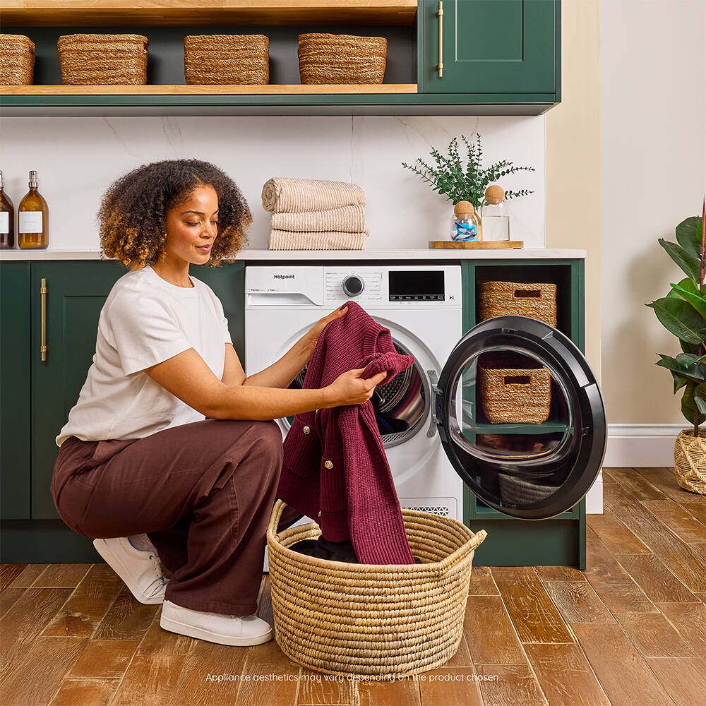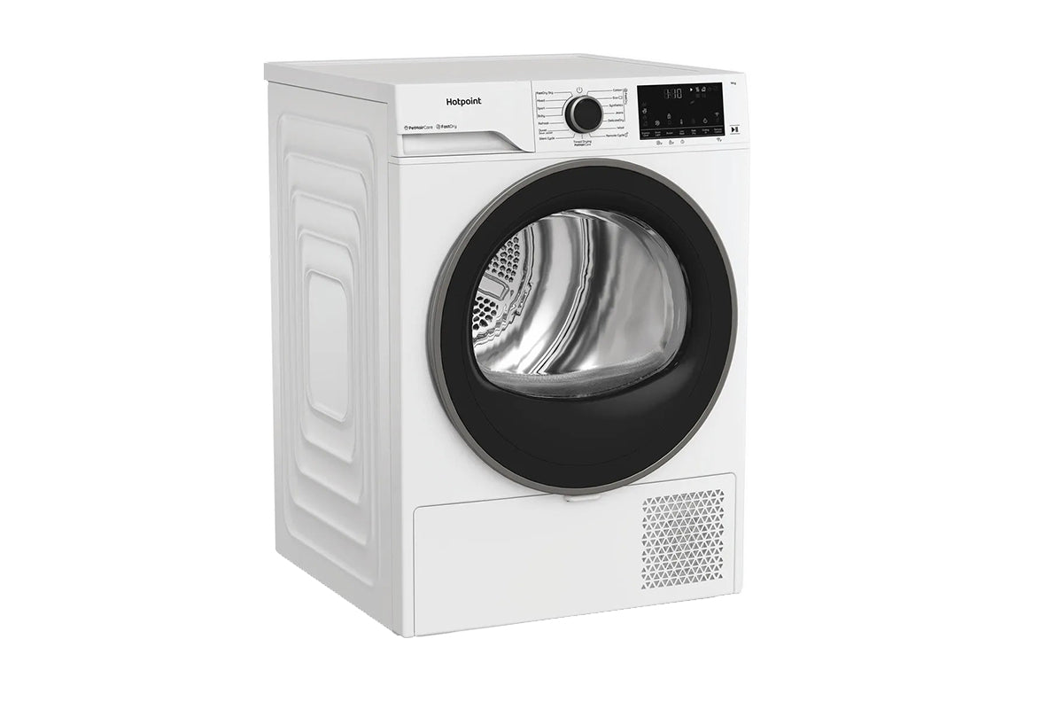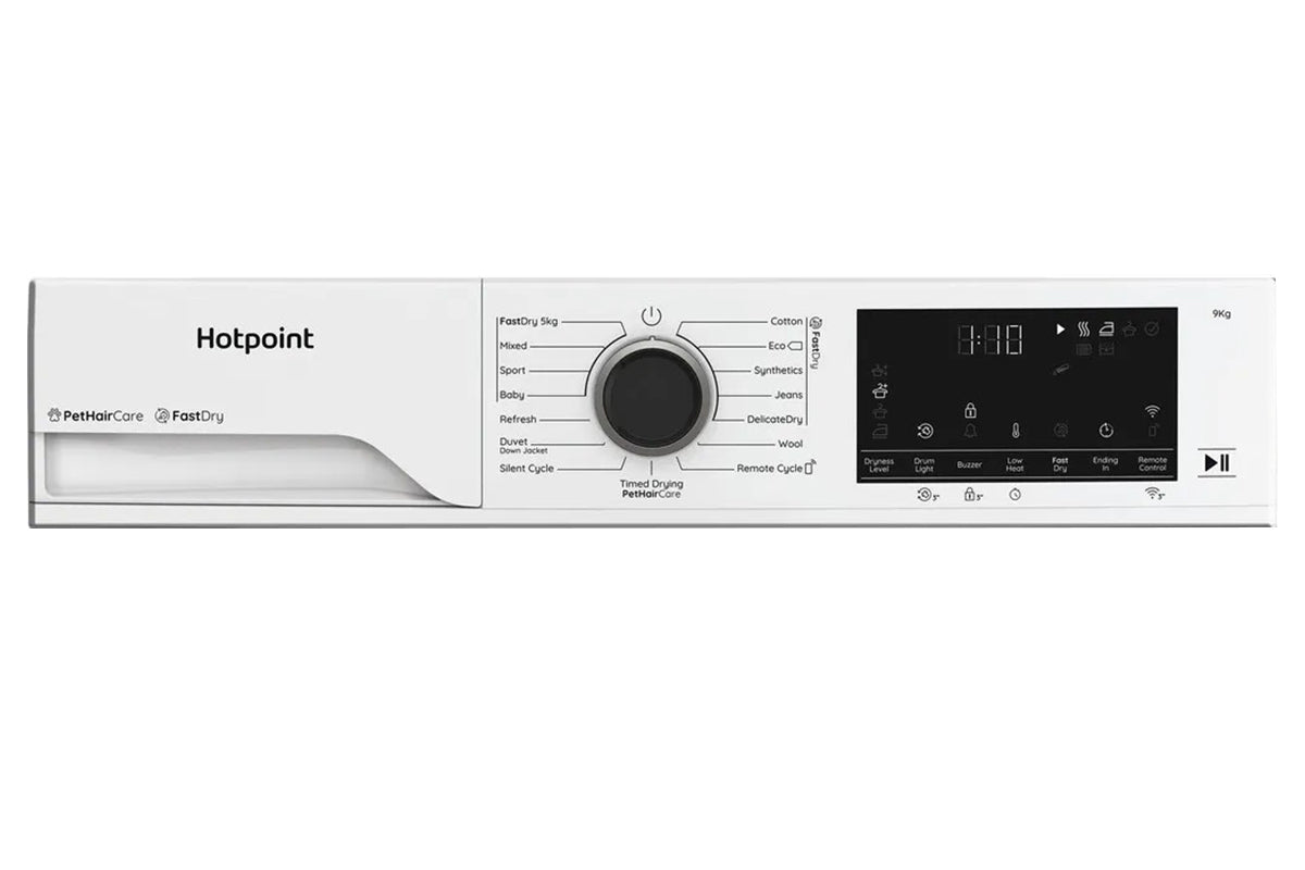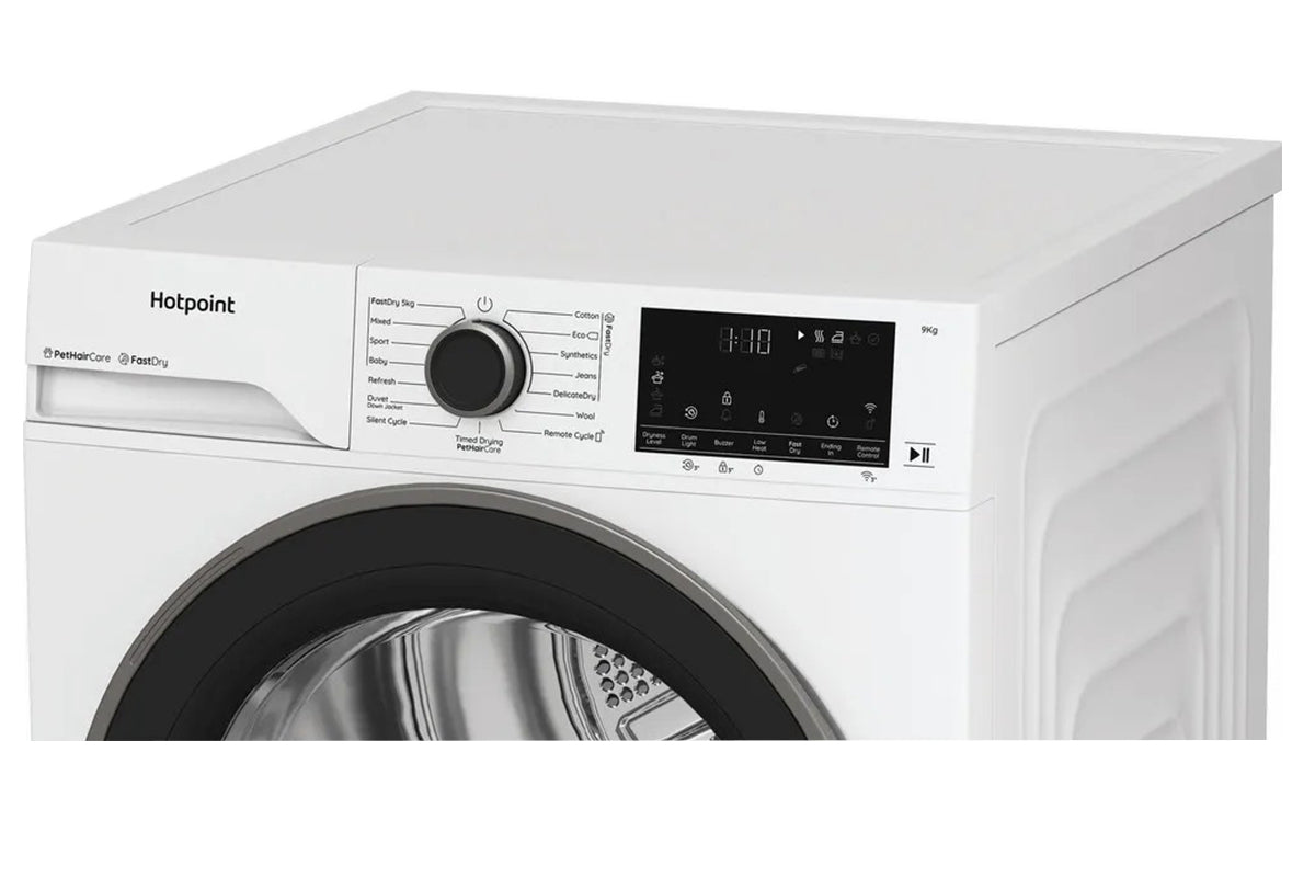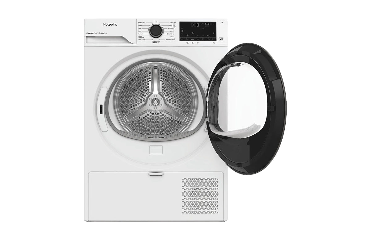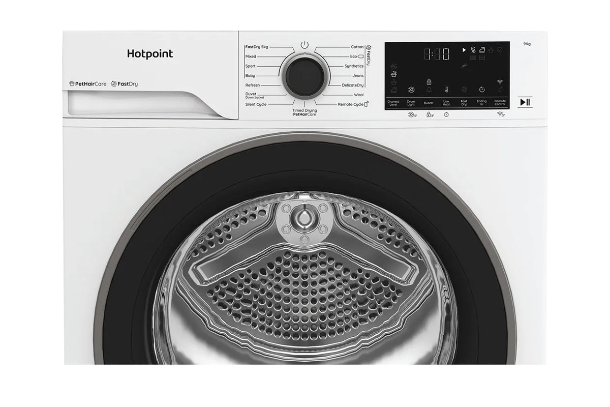 Look after your family's laundry with this energy-efficient Hotpoint heat pump tumble dryer in classic white. With a generous 9kg drum, it’s perfect for getting through laundry days without any fuss. Featuring Heat Pump technology, it dries gently at lower temperatures, using up to 77% less energy* while still delivering great results. If you’ve got pets at home, the clever PetHairCare cycle uses a gentle burst of steam to loosen fibres and reduce static – helping hair lift away and get caught in the filter, not on your clothes. Need laundry done in a hurry? FastDry tackles 5kg of clothes in just one hour. And for those delicate items that need extra care, DelicateDry uses lower heat to protect fabrics and help prevent shrinking. Plus, with the ColdGuard progamme, you can install this dryer in a garage or outbuilding, so you can make the most of your space. Upkeep is simple too, thanks to the Easy Clean Filter – a combined lint and condenser filter built into the door for easy access. With the HomeWhiz app, you can manage your dryer straight from your phone, for even more convenience. What's more, you can enjoy all of these thoughtful features without worrying about your electricity bills. *Compared to condenser tumble dryers of B energy class.