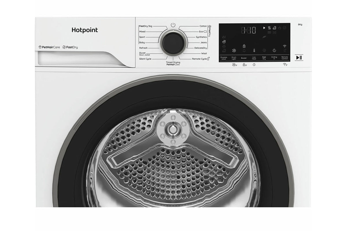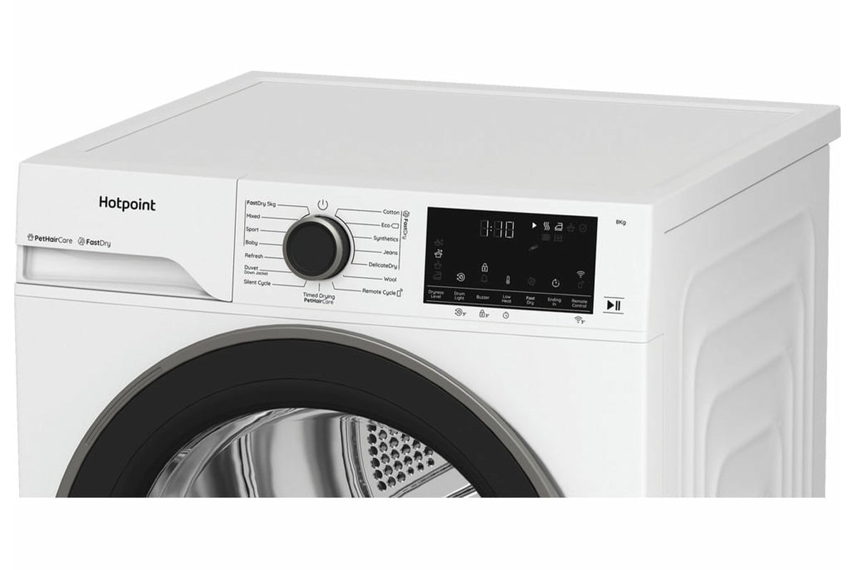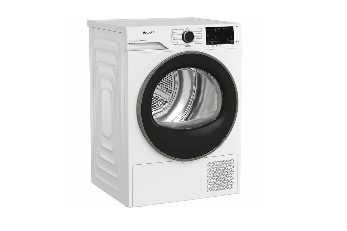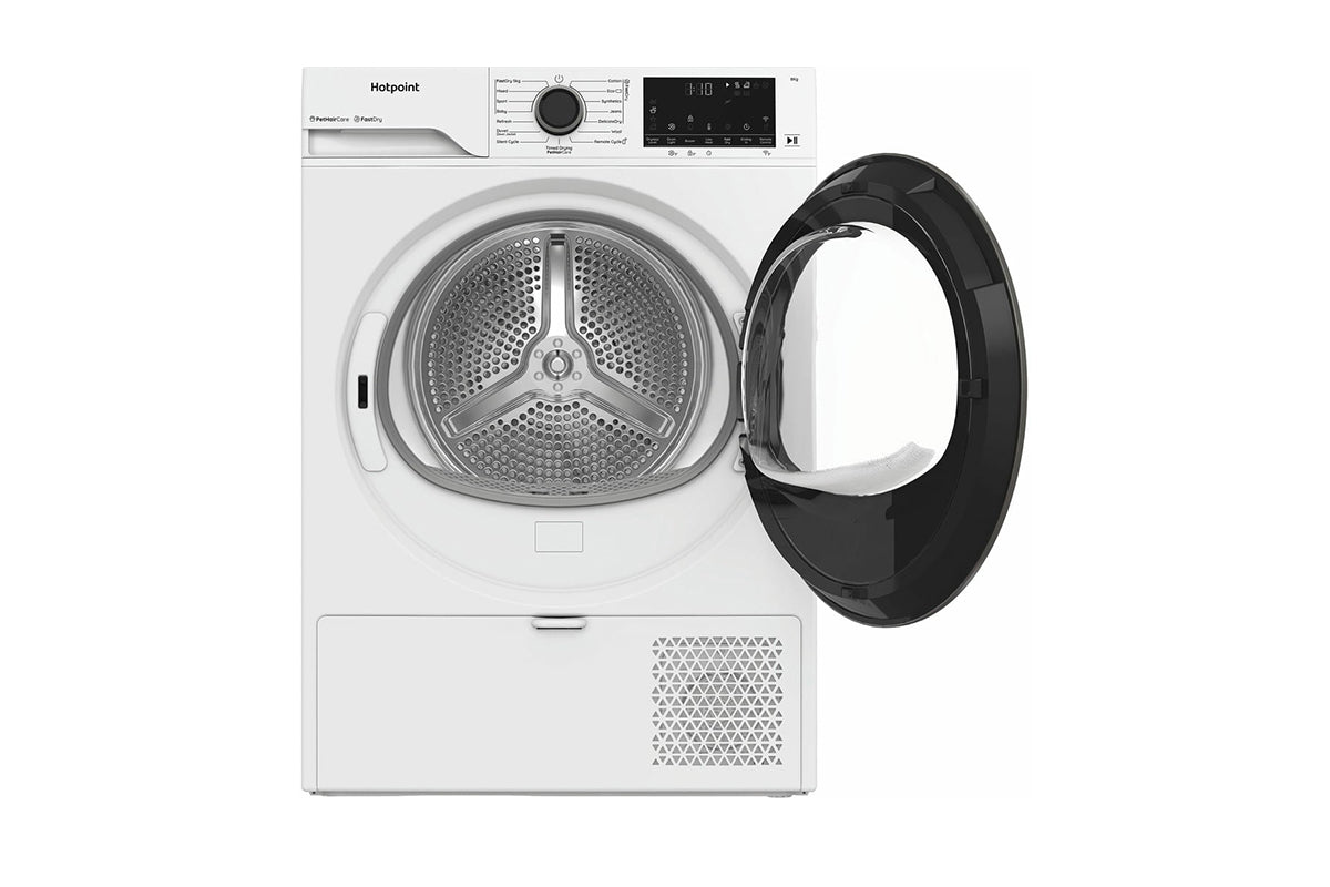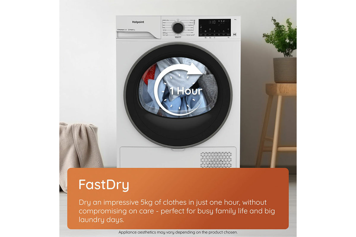Give your laundry the care it deserves with this Hotpoint FabricCare tumble dryer. Finished in white with a spacious 9kg drum capacity, it's ideal for busy families - handling everything from school uniforms to bedding effortwith ease. Heat Pump technology gently and efficiently cares for your clothes, drying at low, protective temperatures while using up to 77% less energy*, helping to keep your bills in check. If you're short on time, the FastDry function dries an impressive 5kg of clothes in just one hour, without compromising on care. And if pets are part of family life, you’ll also love the PetHairCare cycle, which gently lifts pet hair from fabrics with a burst of steam. For your favourite items, DelicateDry uses a lower heat to gently protect fabrics and help prevent shrinking. Plus, the ColdGuard programme means you can safely run your dryer in garages or outbuildings, giving you more options when kitchen space is limited. Our Easy Clean Filter makes maintenance a breeze too. It combines the lint and condenser filters into one smart-design that's easily accessible in the door. For added convenience, our smart app lets you manage your dryer any time, anywhere. Start a drying cycle, customise the settings and receive progress updates all from your phone, so you can keep your home running smoothly. *Compared to condenser tumble dryers of B energy class.