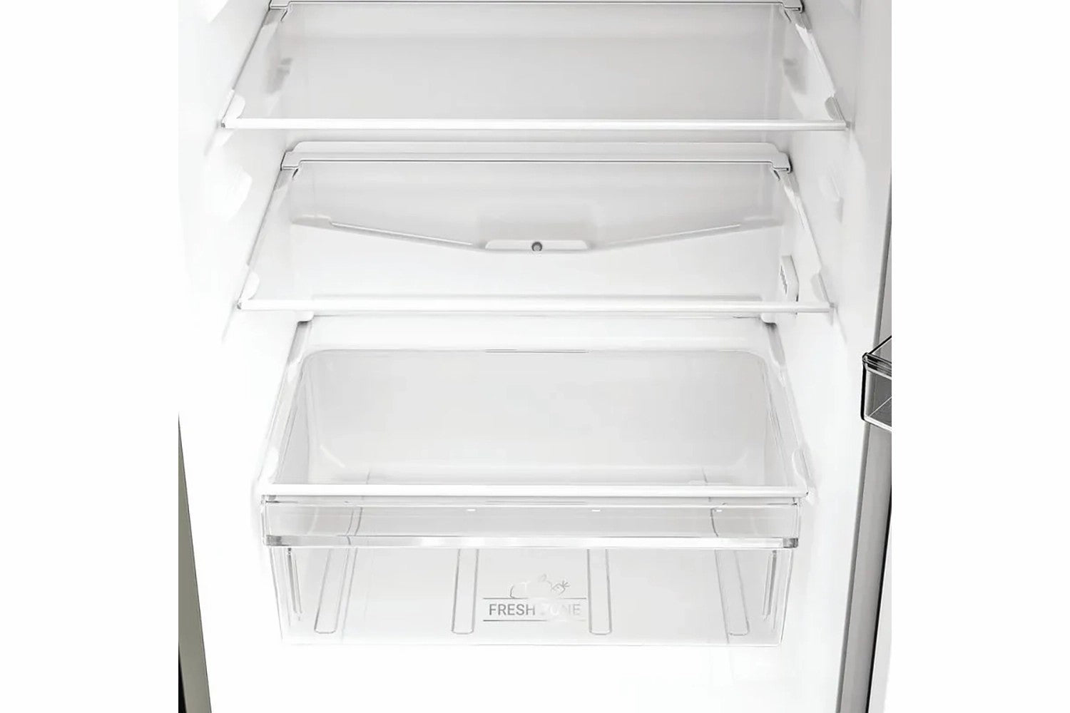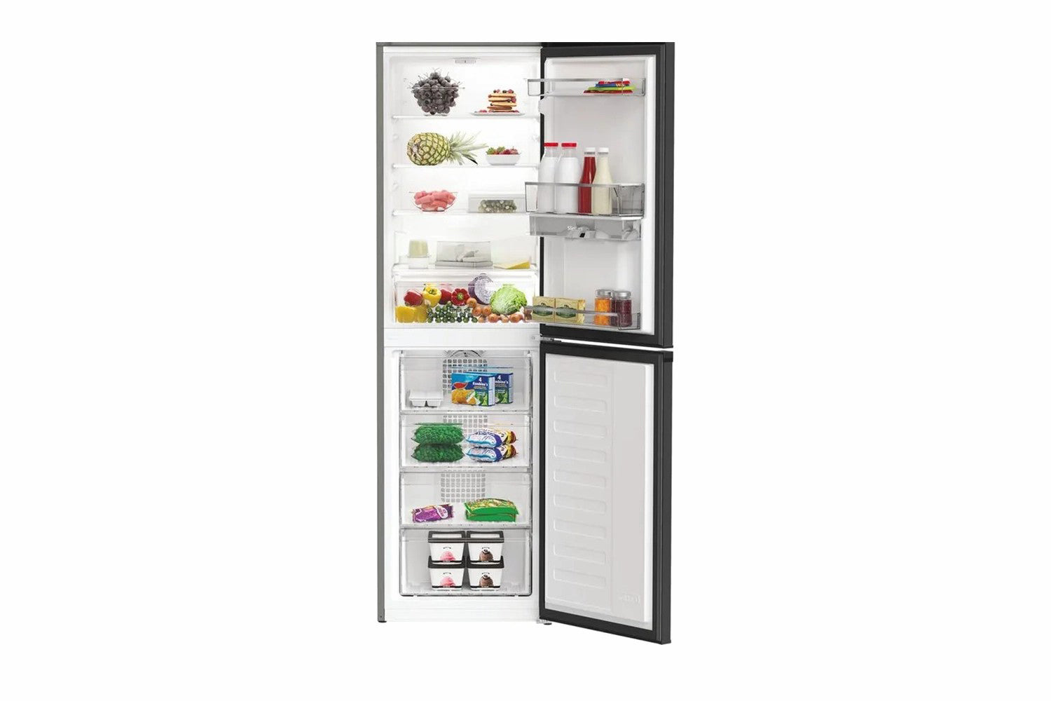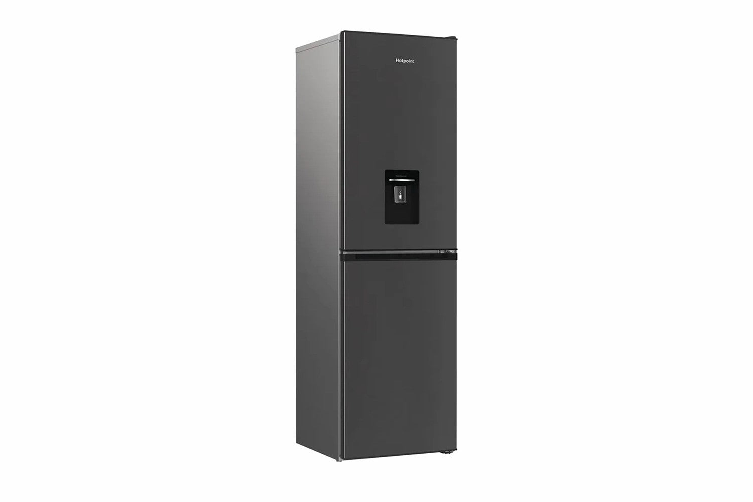 This Hotpoint freestanding 50/50 fridge freezer in sleek dark grey features thoughtful technology that keeps your food fresh and prevents waste. With a spacious capacity of 270L, it provides ample space for 15 shopping bags, so you can easily fit all your groceries in. Hotpoint clever No Frost technology ensures a constant airflow inside the freezer, so you'll never have the dreaded chore of defrosting it. Inside you'll find a dedicated Fresh Zone drawer, which maintains the correct temperature for crisp salad and long-lasting vegetables, while adjustable shelves give added flexibility to accommodate larger items effortlessly. Bright LED lighting illuminates the interior of your fridge so you can see everything clearly, and the reversible door design lets you position it perfectly in your space. Outside, the integrated water dispenser lets you quench your thirst instantly with quick and easy access to chilled water.