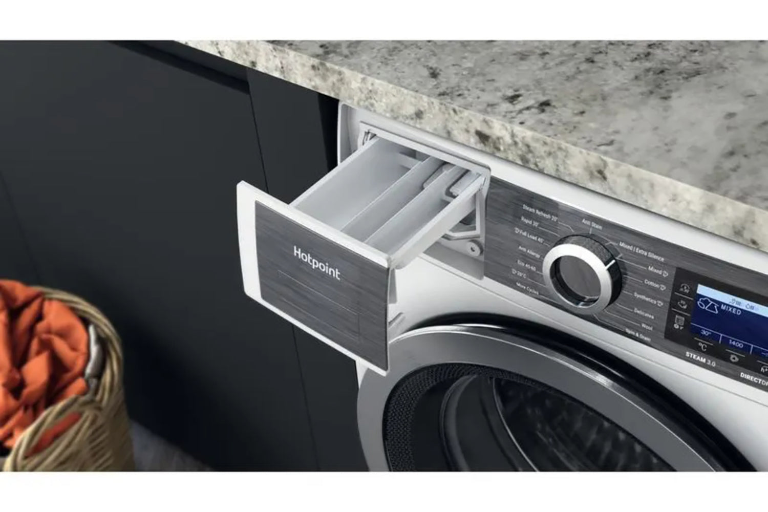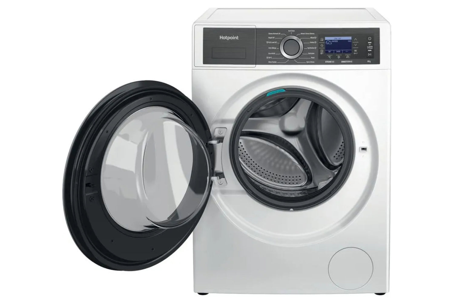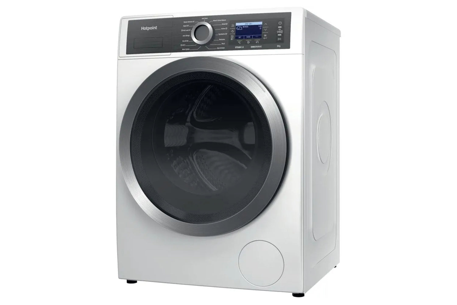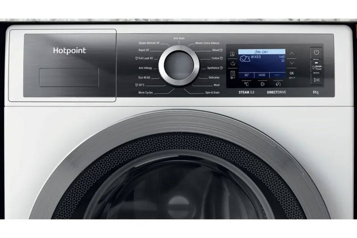 Discover a washing machine thoughtfully designed to deliver powerful cleaning results. The Hotpoint H7 89 GPOWER UK Washing machine boasts an authentic design and a 8kg drum capacity. GentlePower Technology carefully sprays a mix of water and detergent onto laundry like a waterfall, providing a thorough wash while minimising energy and water usage. This keeps your laundry feeling great and saves you money. Powerful performance can still be gentle on your energy use and your wardrobe. Rated A class for both energy & noise, this washing machine is ideal for any household and uses 30%* less energy compared to other A rated models. The innovative Direct Drive motor replaces the traditional belt driven motor with high-performance direct drive motor that rotates the drum directly, offering quality, reliability and minimum noise levels. Plus when all you need is silence at home the extra silent cycle, takes care of laundry, at any time of the day. Operating as low as 72dB for the whole cycle, which is as quiet as a normal conversation. For added versatility, discover the power of steam and achieve ultimate cleaning results and peace of mind, Steam 3.0 technologies provide ultimate cleaning results with three options to choose from. The Steam Hygiene cycle reduces bacteria thanks to a prolonged high temperature; the 20-minute Steam Refresh cycle refreshes clothes without washing; and finally, the Steam Finish option keeps your laundry soft and crease-free, for up to 6 hours after the end of the cycle. *On use of the Eco 40-60 cycle and compared to the minimum required to be considered A class. Validated by internal tests.