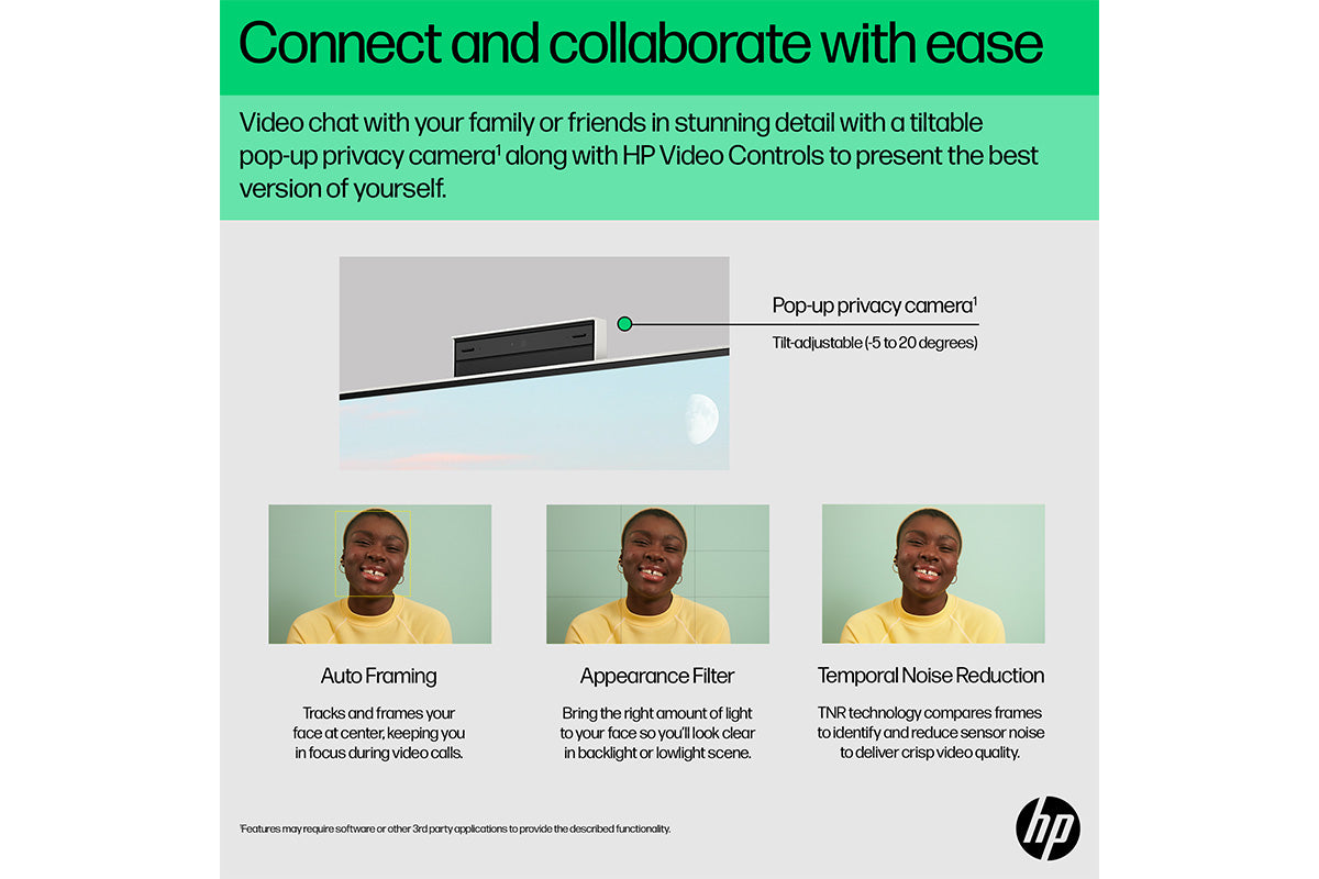 Made for true collaboration with a tiltable, pop-up privacy camera 5, dual mics, and advanced noise-reduction.