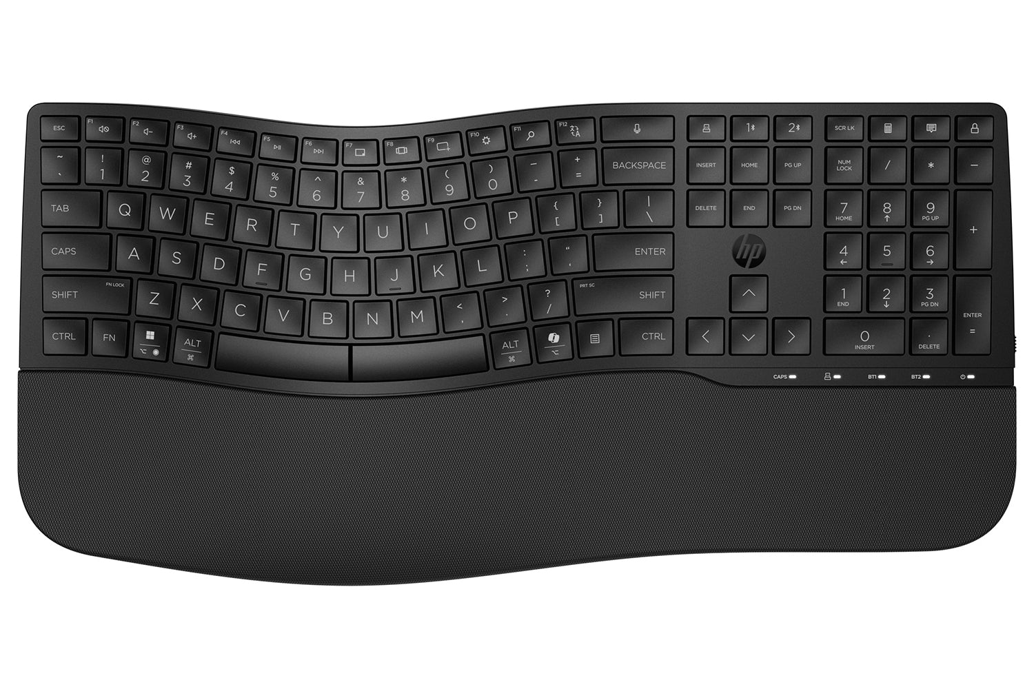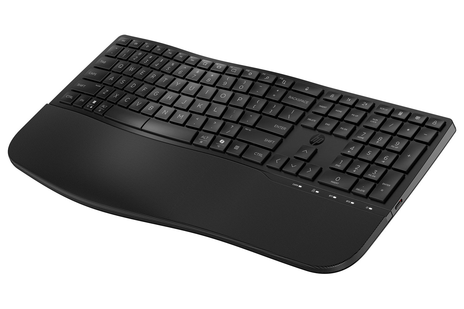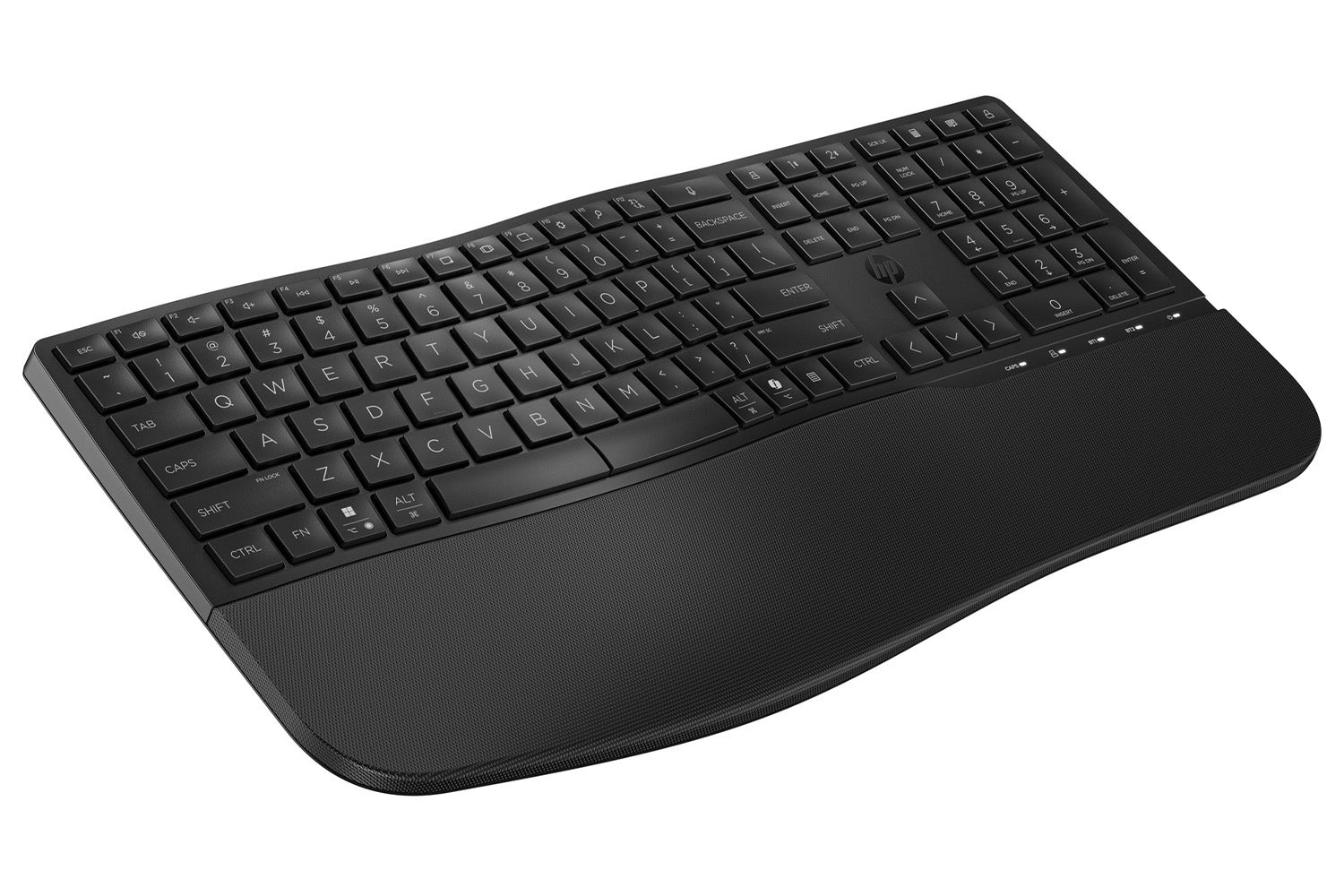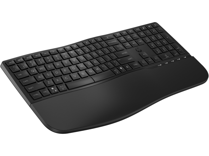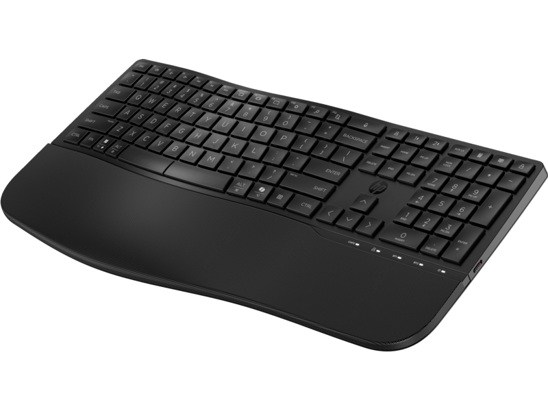The HP 680 Comfort Dual-Mode Keyboard fits to your style with adjustable angles, programmable keys (1), and secure HP Unifying Dongle and Bluetooth connectivity.