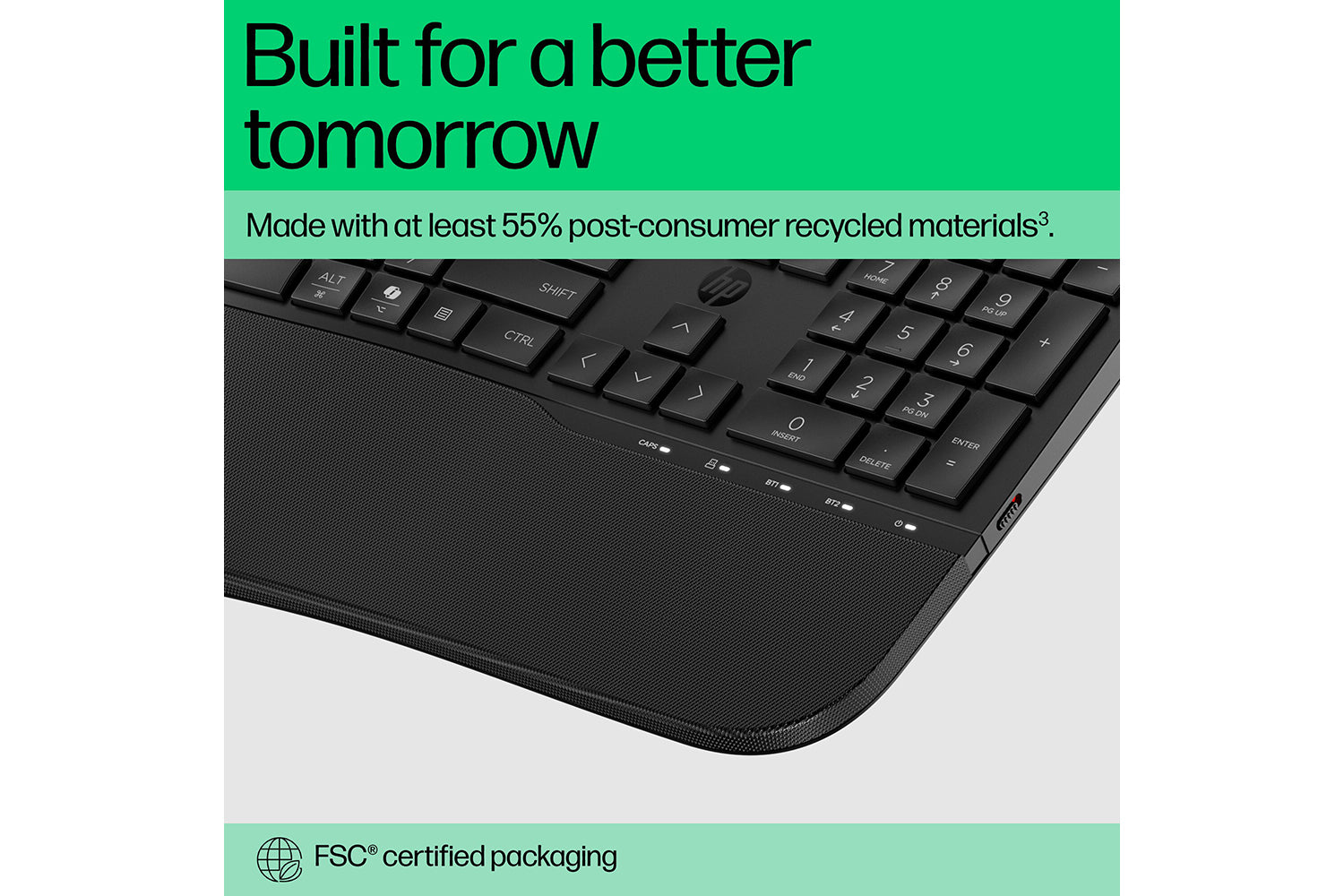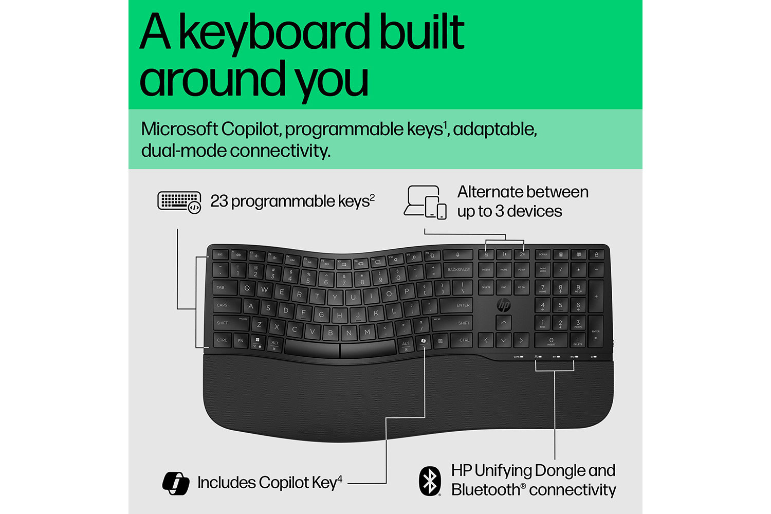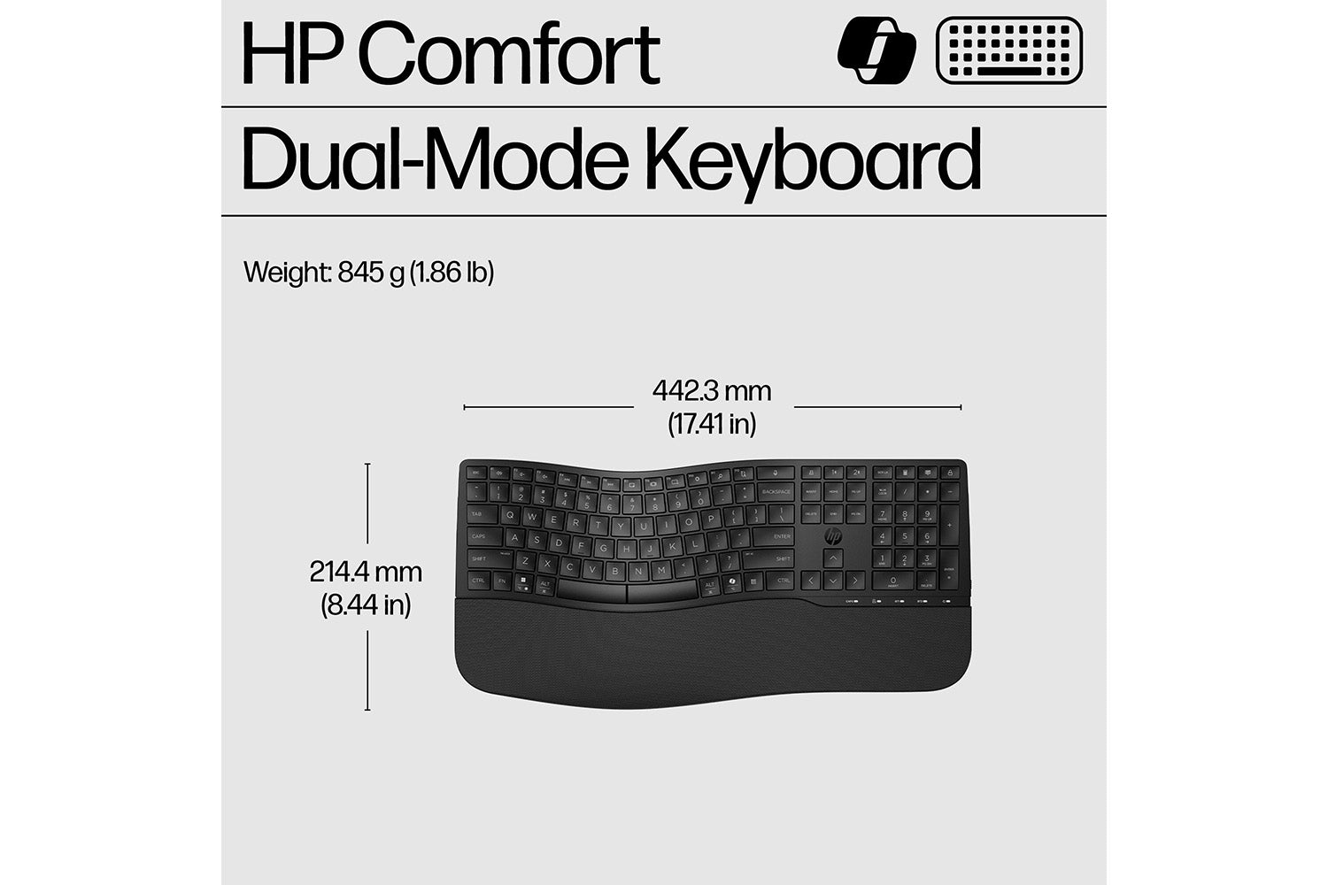 The HP 680 Comfort Dual-Mode Keyboard fits to your style with adjustable angles, programmable keys (1), and secure HP Unifying Dongle and Bluetooth connectivity.