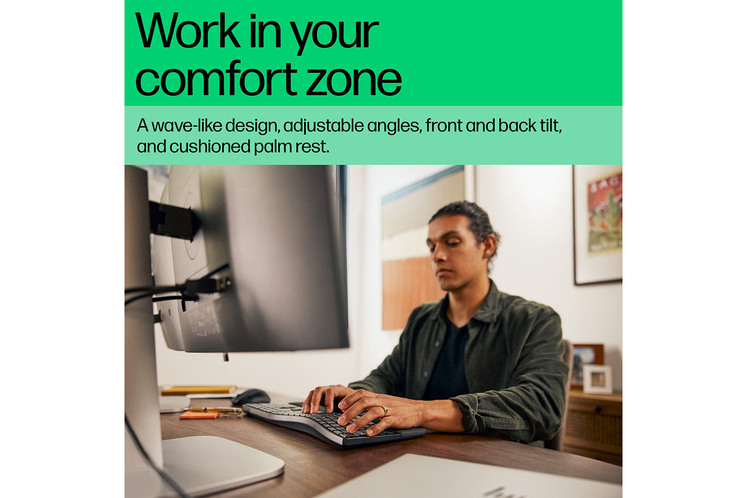 Make any long day feel easier with this comfort-first keyboard. Its wave-like shape, adjustable typing angles with front and back tilt, and cushioned palm rest help you power through even the hardest days with features built to keep you at your best.