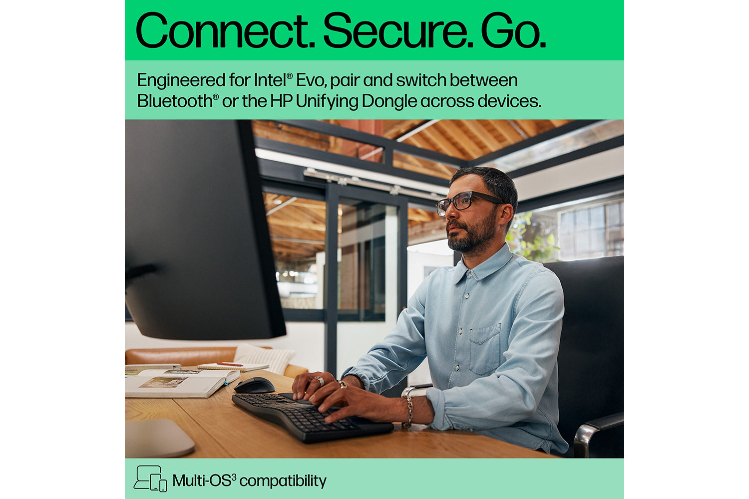 Be secure in knowing this dual-mode keyboard syncs multiple devices worry-free. Pair and switch between Bluetooth or HP Unifying Dongle across devices. Engineered for Intel Evo and multi-OS (2) compatible, you’re ready to connect to a smoother, more secure workflow.