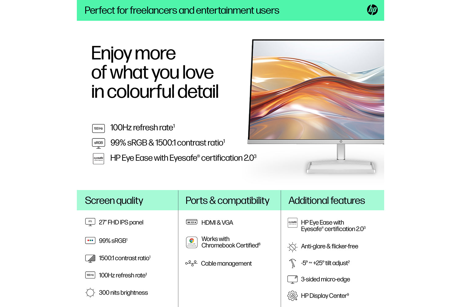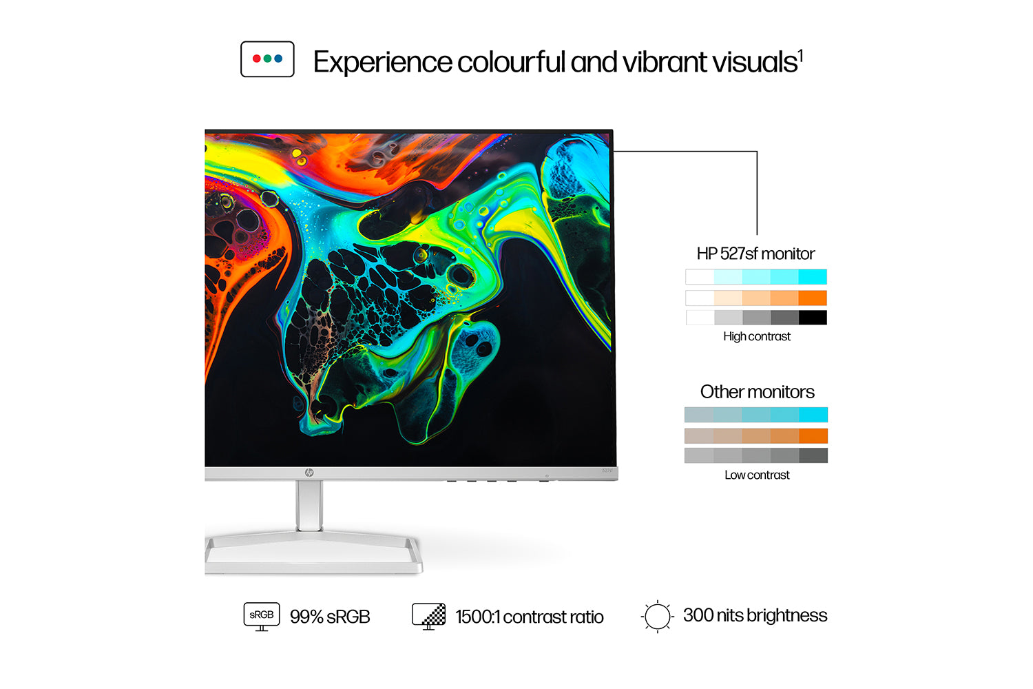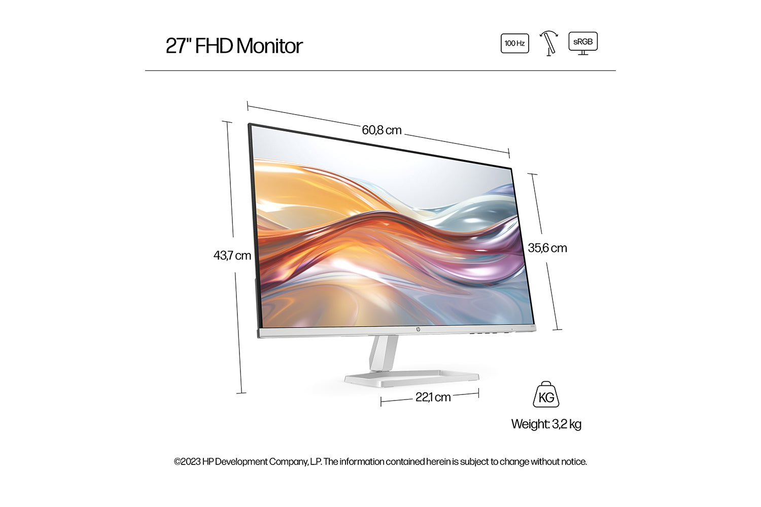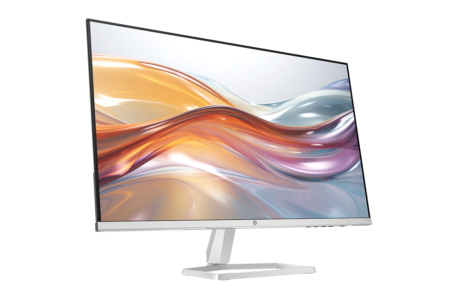 The HP Series 5 27-inch FHD Monitor gives you the flexibility to enjoy entertainment with its sleek, thin-and-light design, vibrant color, deep contrast ratio, and higher refresh rate for a no-screen-tearing experience.