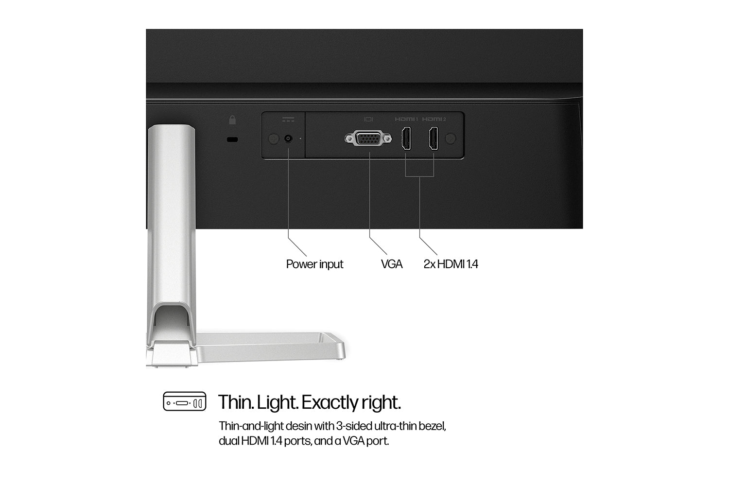 This thin-and-light 27-inch FHD monitor is designed to look great in any space. Whether learning, playing, or watching content, its ultra-thin 3-sided borderless design lets you create a seamless dual-screen setup for enhanced viewing, while the simplified cable management cuts the clutter. Plus, easily connect with one VGA and two HDMI 1.4 ports.