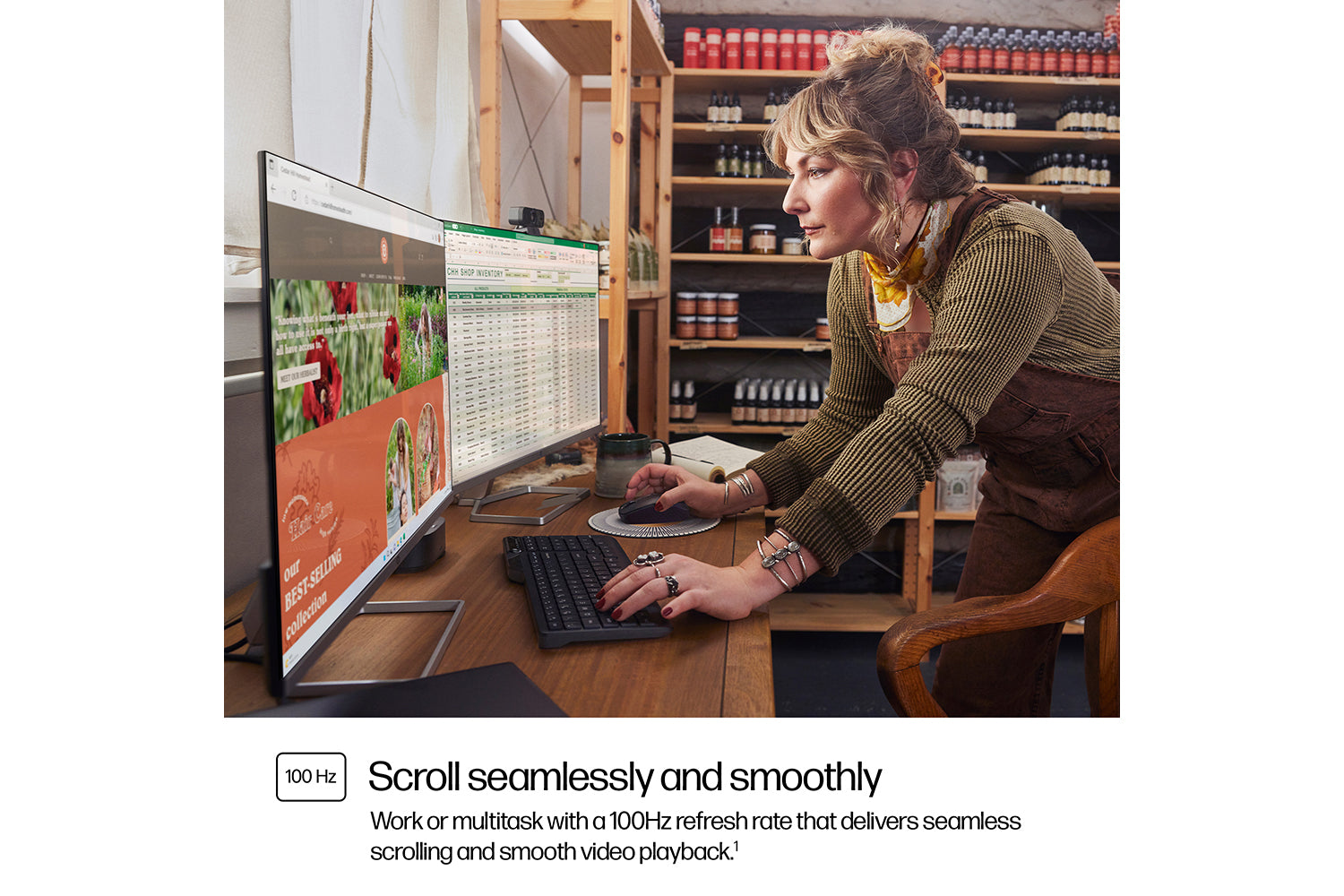 Sit back and soak in all the content you love with this exceptional 27" FHD monitor. Experience colorful imagery and vibrant detail like they were intended with 99% sRGB color, deep 1500:1 contrast ratio, and 300 nits brightness. Its 100 Hz refresh rate delivers seamless scrolling and smooth, stutter-free viewing.