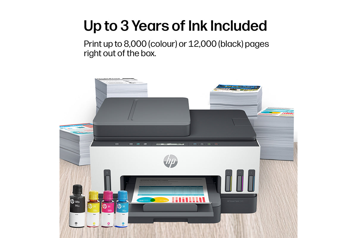 1. Up to three years of Original HP Ink included: Based upon 200 pages per month of HP Smart Tank customers’ usage. Actual yield varies considerably based on content of printed pages and other factors. Average based on ISO/IEC 24711 or HP testing methodology and continuous printing. Some ink from included bottles is used to start up the printer.