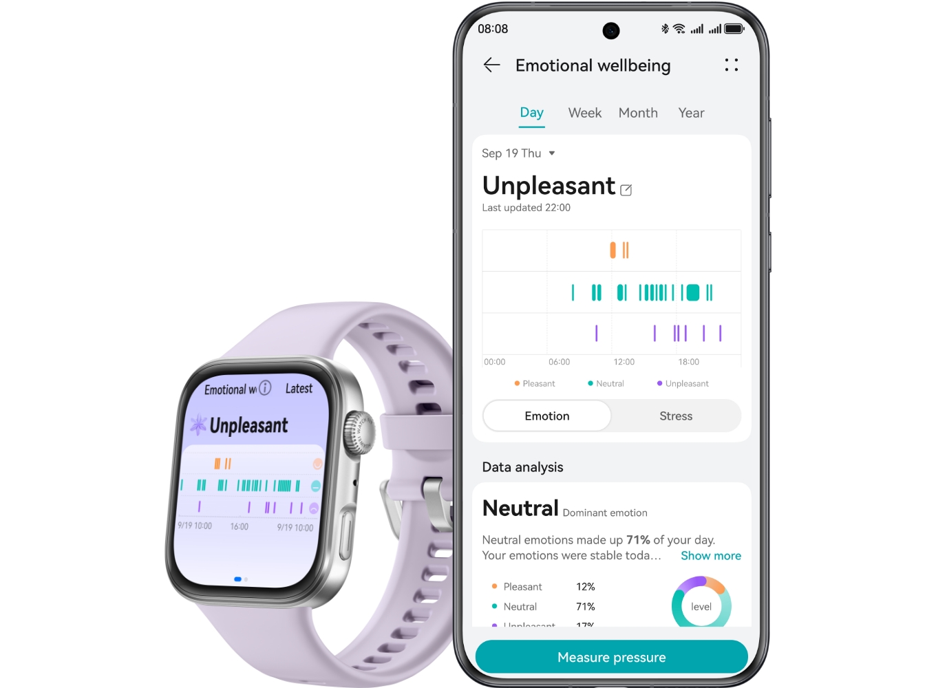 18. Emotion trend tracking data is available in the Huawei Health app. This feature is only available when connected to a 64-bit (but not 32-bit) Android phone or an iPhone that's installed with the latest version of Huawei Health.
