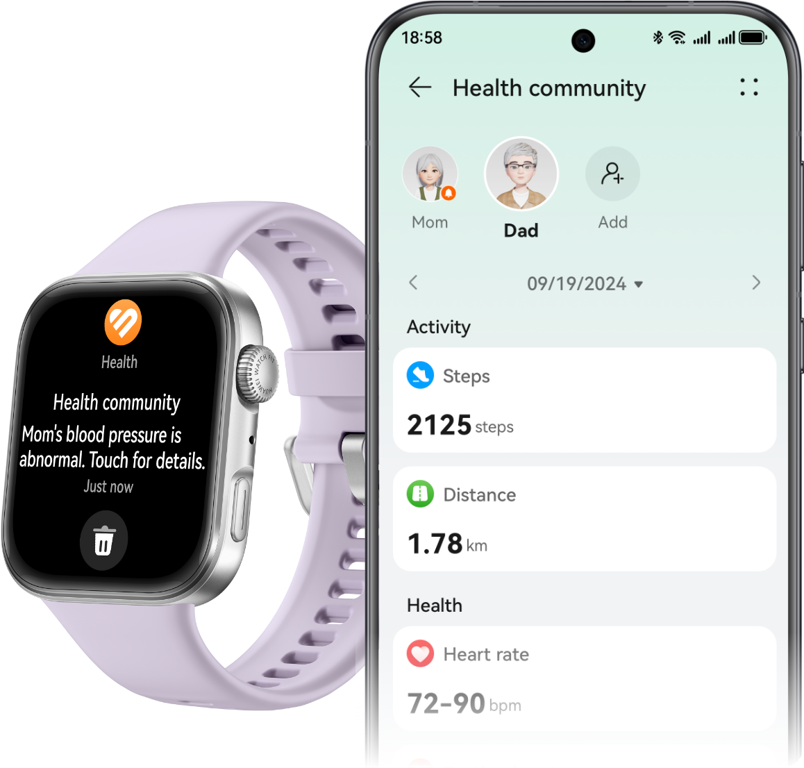 Create a Health community for loved ones[21] and stay up to date with their heart rate, SpO2 levels, daily step count, and sleep quality from one easy place.