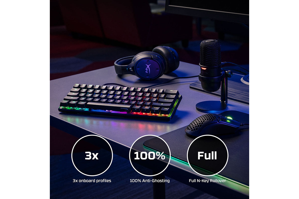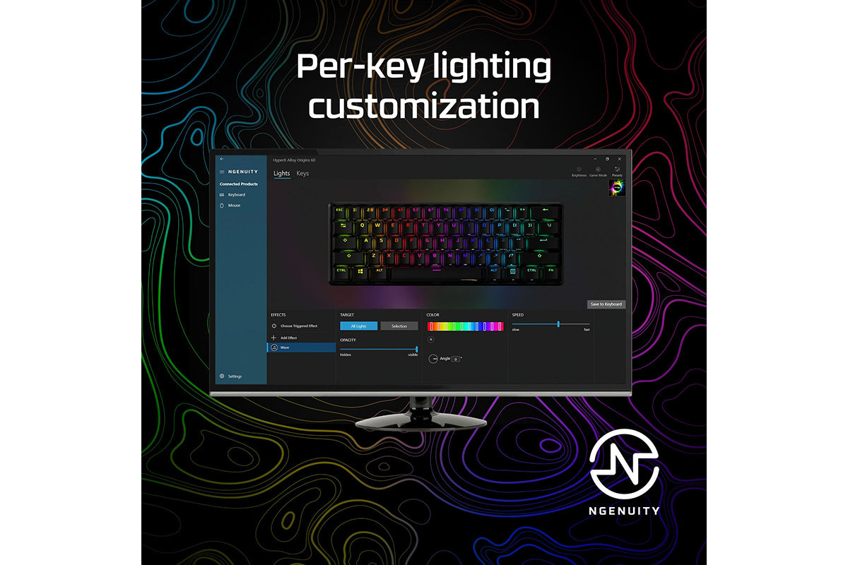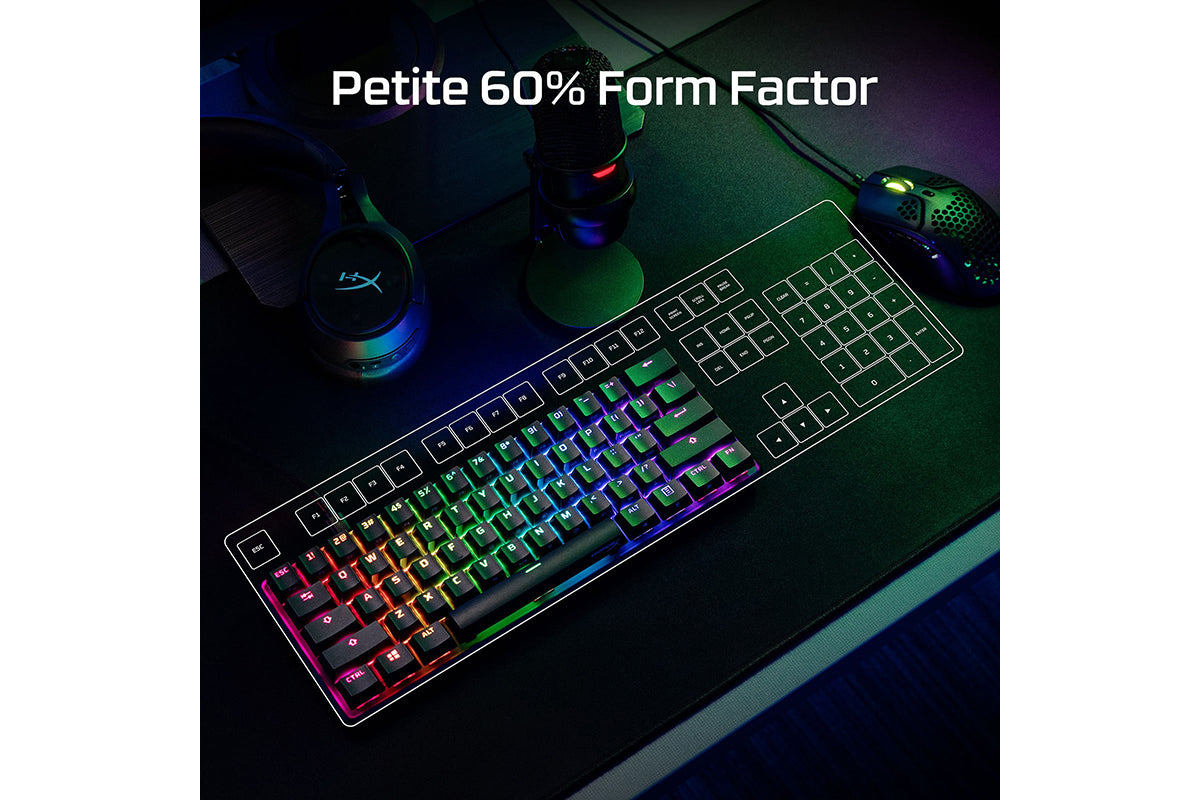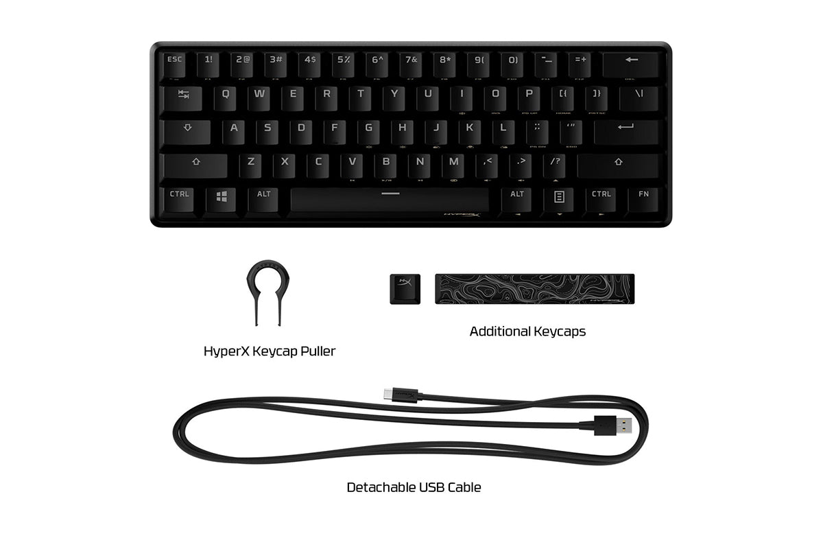 The HyperX Alloy Origins 60 is a supremely portable 60% form factor keyboard that gives you more room for sweeping mouse movements. It features a durable, full aluminum body, and reliable HyperX switches balanced for speed and performance which are rated to withstand 80 million keypresses. The stock double shot PBT keycaps have secondary functions printed on them so you can quickly locate additional functionality. Let your style shine bright with the HyperX switches’ exposed LED design, and stunning lighting effects. Further customize your keyboard with macros, personalized lighting profiles, and more with HyperX NGENUITY software.