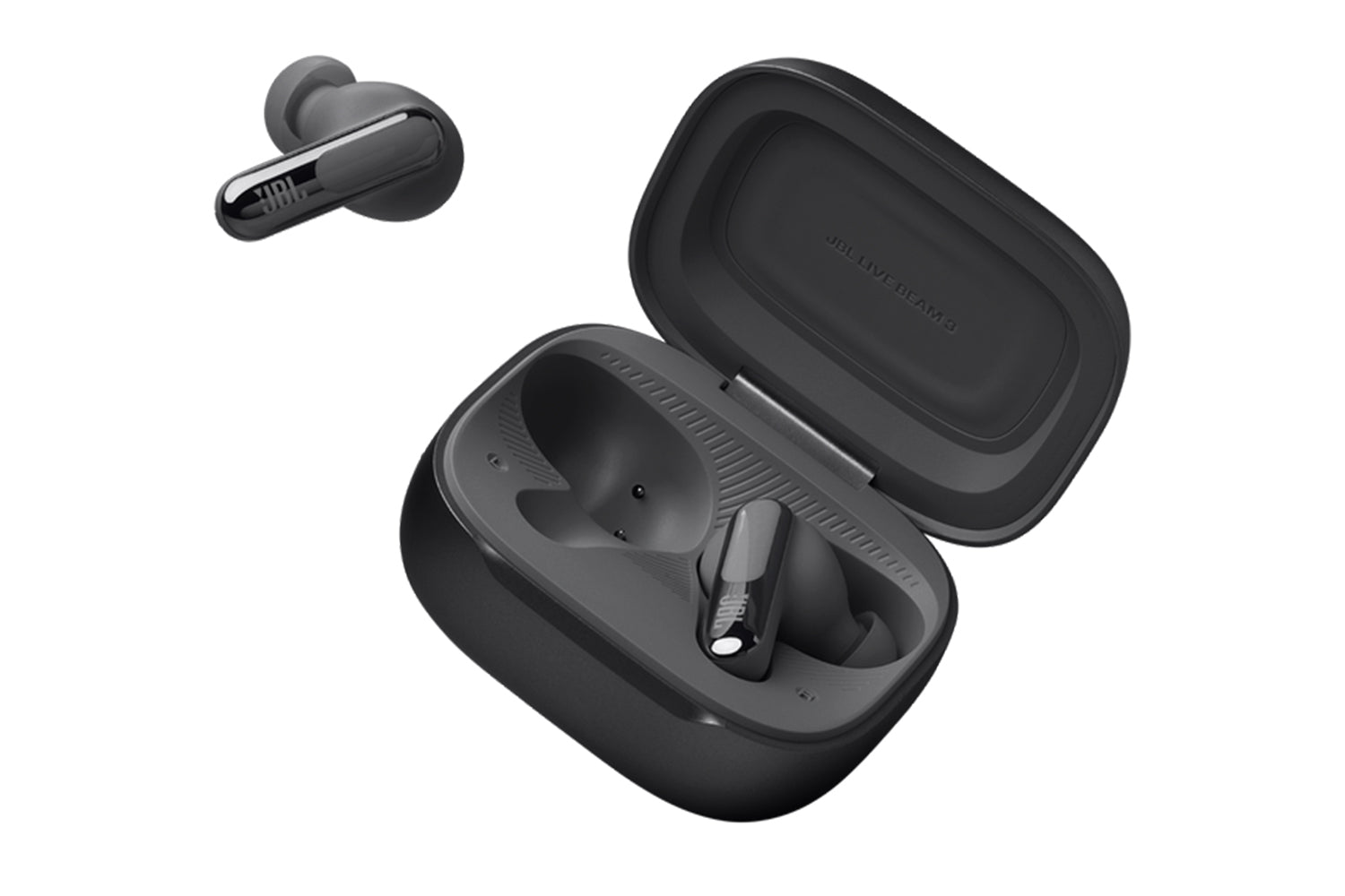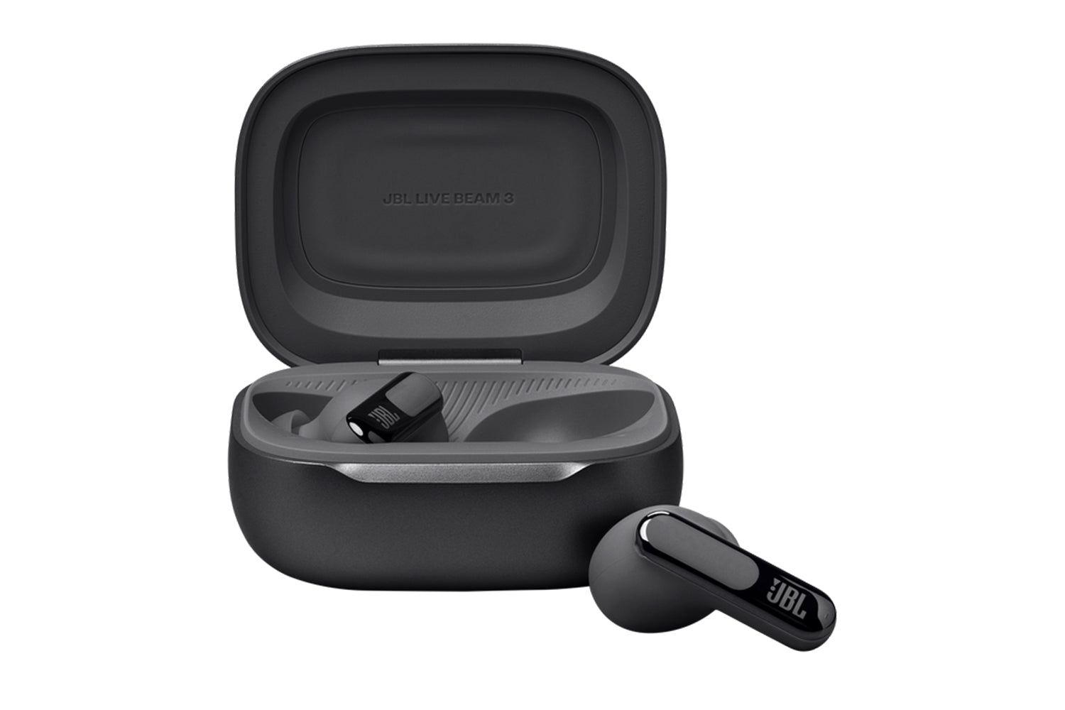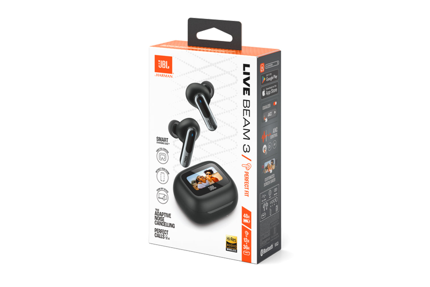 Get customized sound without ever looking at your phone. Use the controls on the Smart Charging Case of the JBL Live Beam 3 true wireless noise-cancelling earbuds with Hi-Res Audio to customize all their features without opening the JBL app on your device. Adjust volume and EQ, control your music, take phone calls, see messages—you can even customize the screensaver with your favorite photos. And that’s before you even get to enjoy the monumental JBL Signature Sound of the Live Beam 3 earbuds themselves. Best-in-class True Adaptive Noise Cancelling tunes out distractions. JBL Spatial Sound makes movies and music truly immersive. And if you have to take a call, 6 mics ensure perfect sound quality even in the noisiest surroundings. All this plus a 48-hour charge: 12 hours in the buds* and another 36 in the case—and they can charge wirelessly. The charging case features a loop to attach a lanyard for even more convenience. Great sound has never been simpler. (*with ANC off)