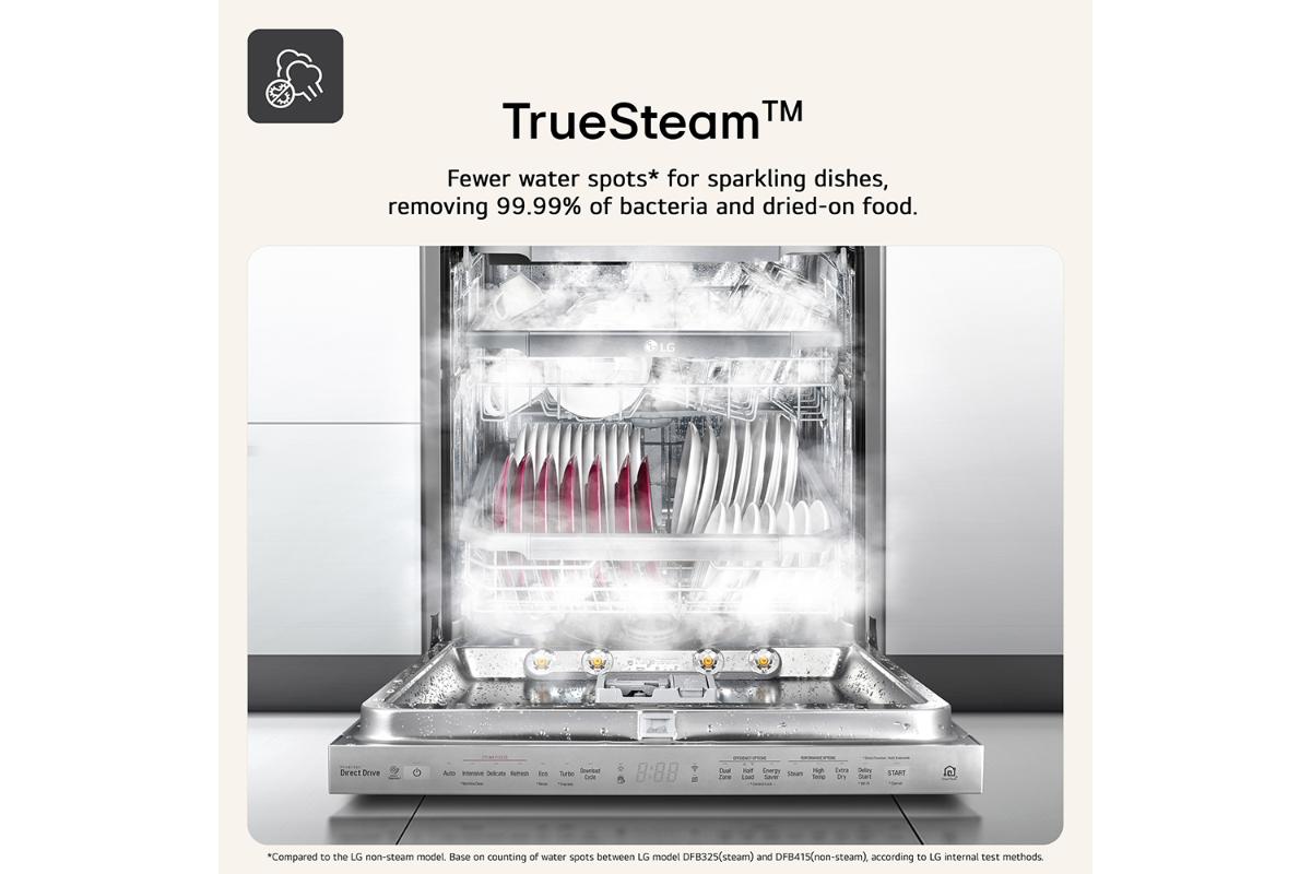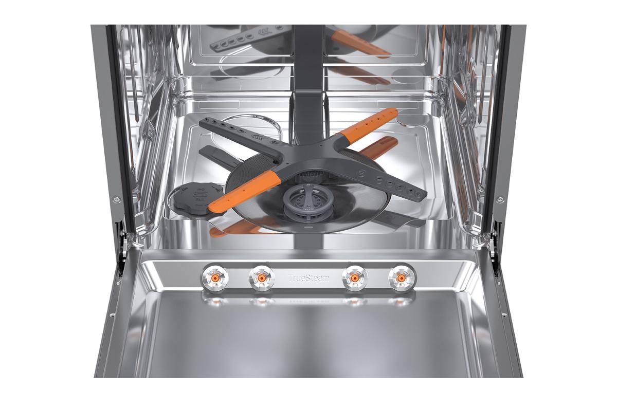 TrueSteam removes 99.9% of bacteria and germs remaining on the dishes with hot steam generated from boiling water of 100 degrees Celsius. The steam is sprayed from the front, bottom and top of the tub to clean and sterilize all dishes. In addition, True Steam even washes away tiny minerals left on the tableware, reducing water spots and leaving the dishes shiny.