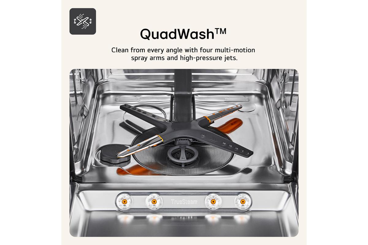 QuadWash is a four wash arm system that sprays water. Normally, other dishwashers have two washing arms, but LG added two more arms to improve the washing performance. Two of the arms pivot and rotate back and forth to sprinkle water, and thoroughly clean every corner without dead zones.