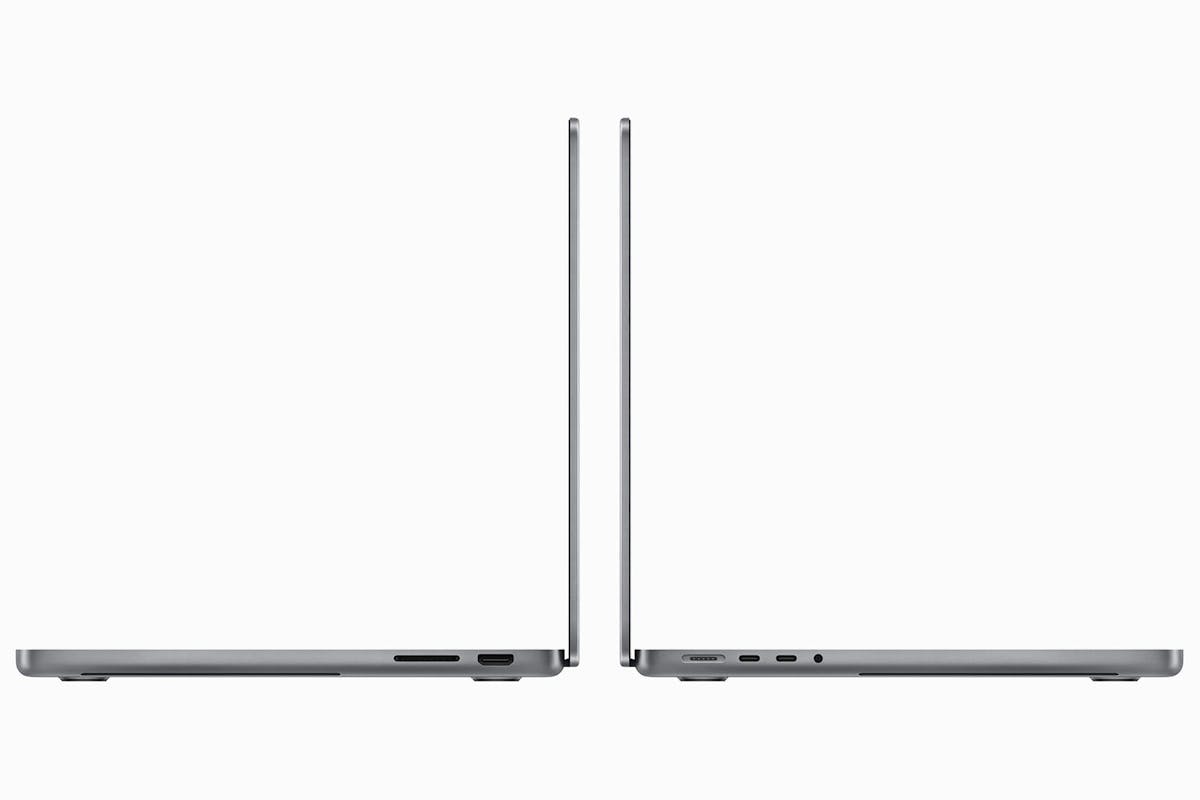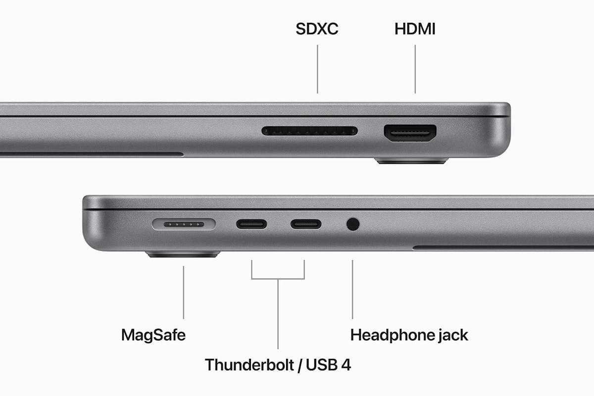 This MacBook Pro features a MagSafe charging port, two Thunderbolt / USB 4 ports, an SDXC card slot, an HDMI port and a headphone jack. Enjoy fast wireless connectivity with Wi-Fi 6E[5] and Bluetooth 5.3. Supports one external display.