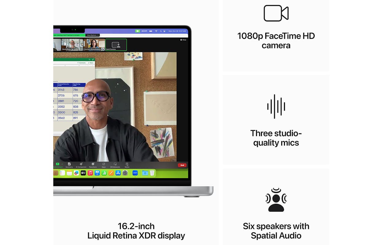 Look sharp and sound great with a 1080p FaceTime HD camera, a studio-quality three-mic array and a six-speaker sound system with Spatial Audio.